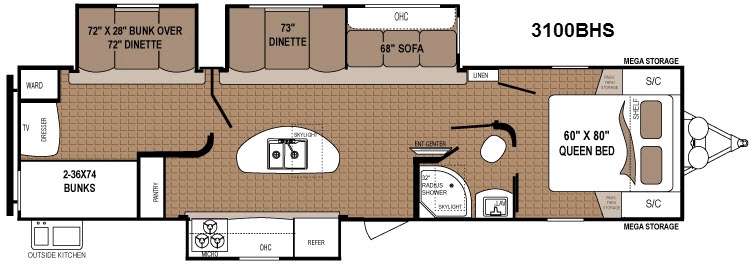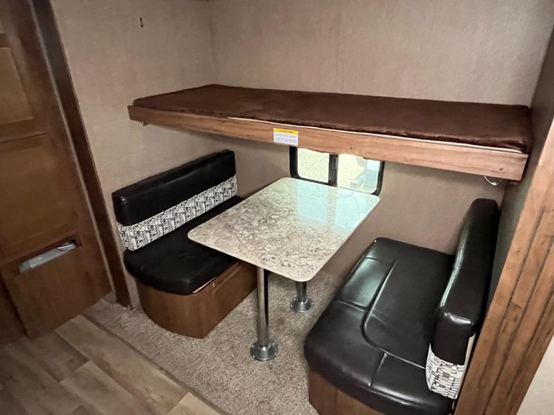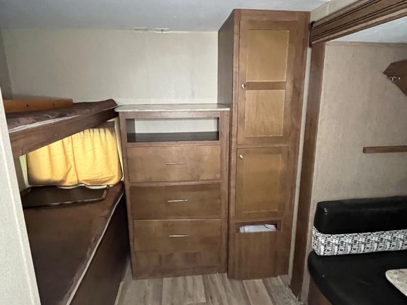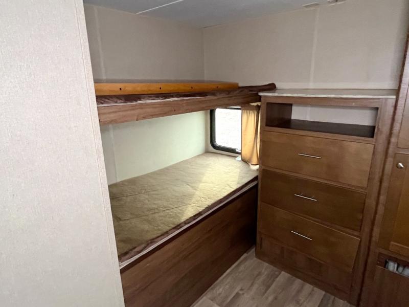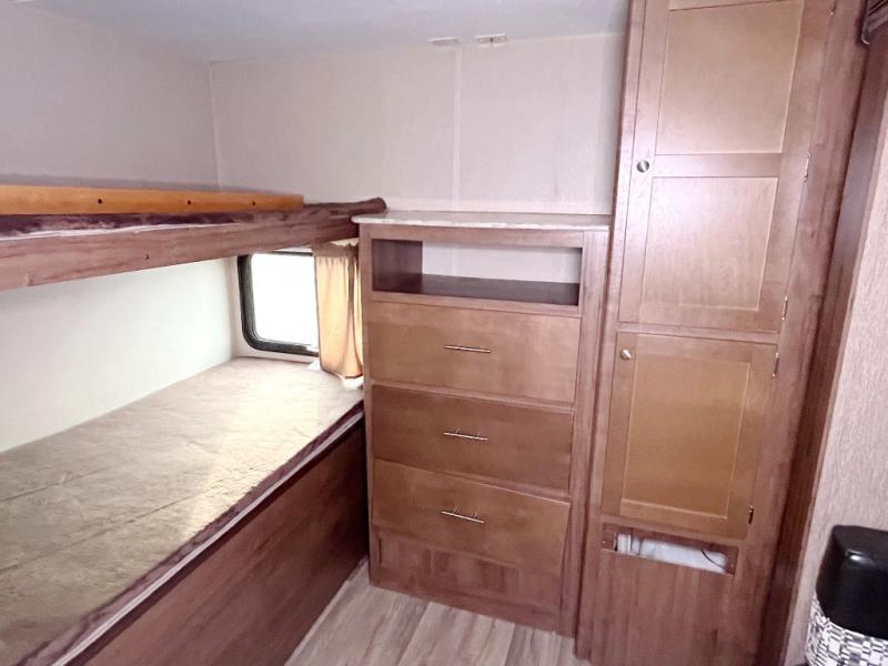 The rear bunkhouse has plenty of space and everything that the kids need to have their own area to hang out. A slide out holds a 72" dinette with a 72"x28" bunk over it. Along the back wall there is a wardrobe and a dresser with space for a TV. The opposite wall offers two 36"x74" bunk beds.