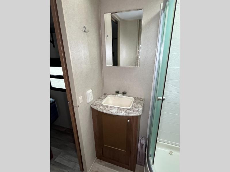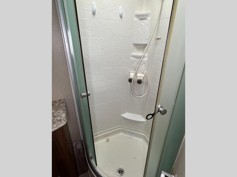 As you move to the front of the Aspen Trail 3100BHS, an entertainment center is located on the outside wall of the side aisle bathroom. The bathroom has double entry, a 32" radius shower, a skylight, a sink and a toilet. A linen closet is across from the bath.