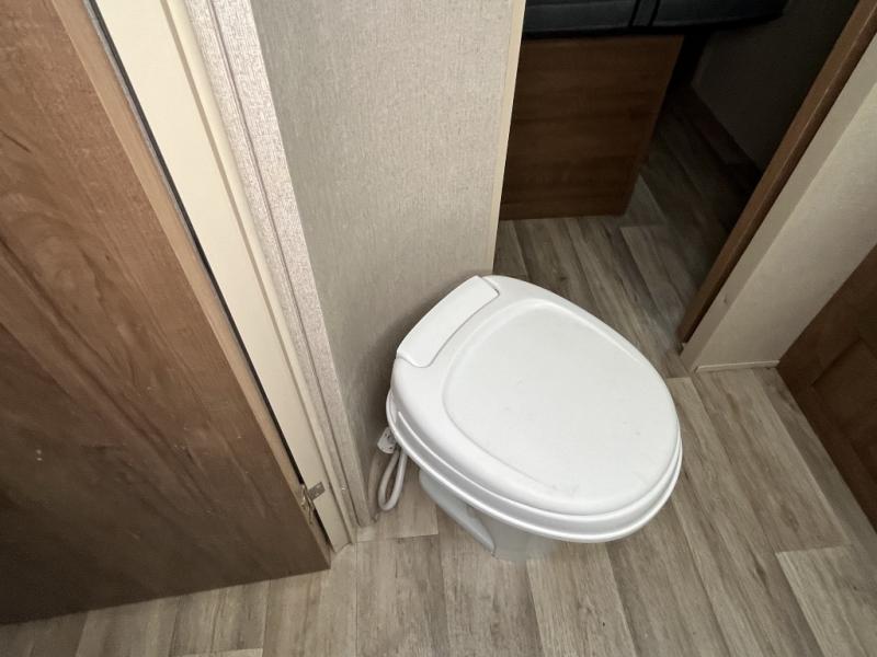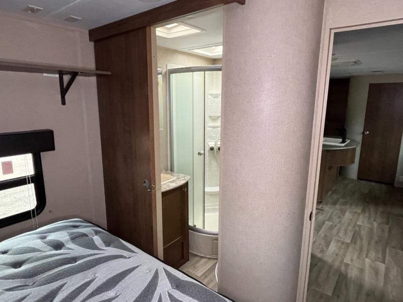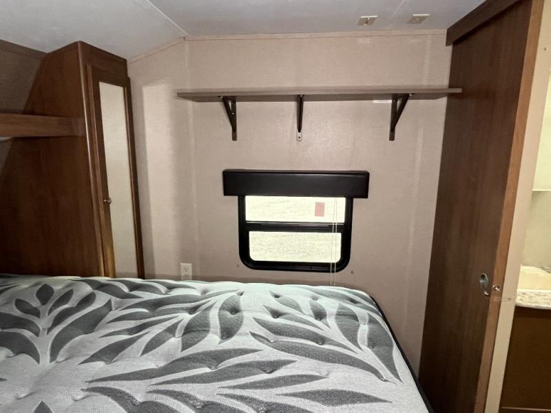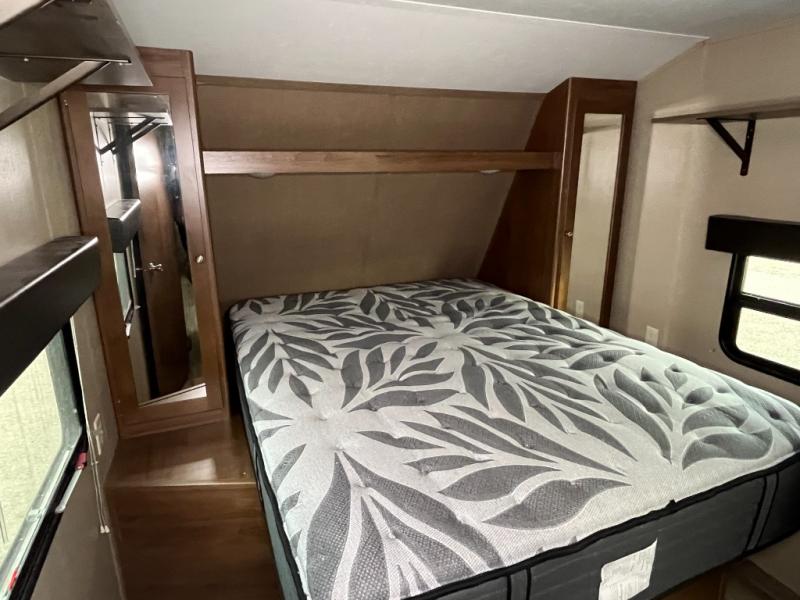 The front private bedroom offers a queen size bed, shirt closets over nightstands and pass through storage on each side of the bed, with a shelf at the head of the bed. Mega storage is also included on both sides at the front.