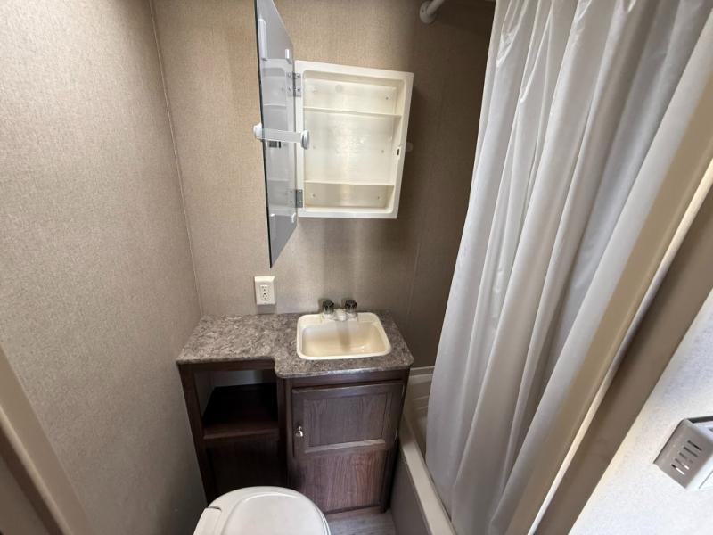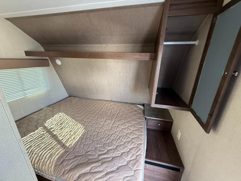 Step inside and see a queen size bed along the front of this unit with a large storage shelf that stretches across the front wall. There is a nightstand and shirt closet just off the foot of the bed to the right of the main entry door.