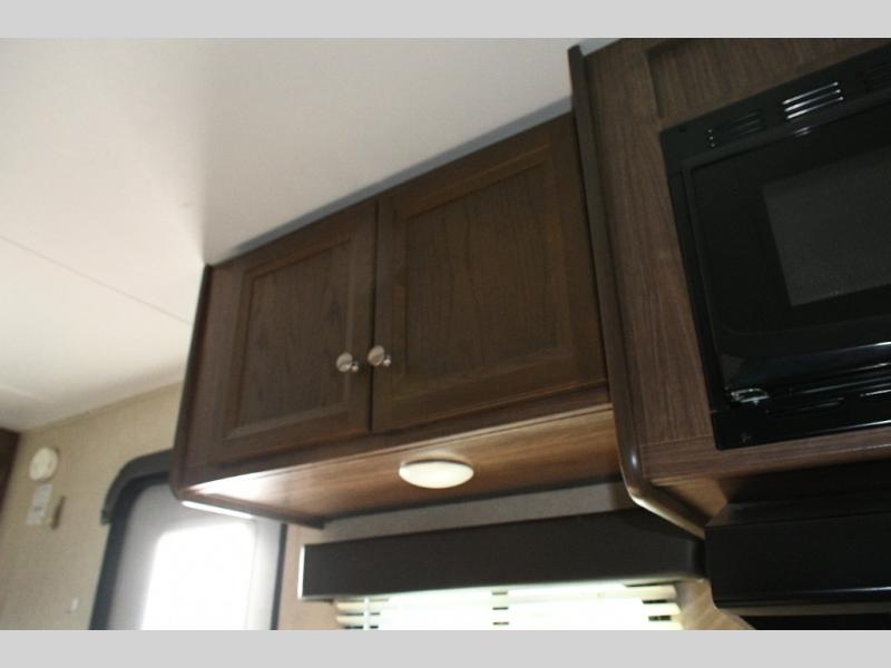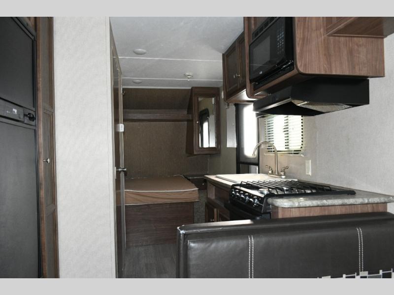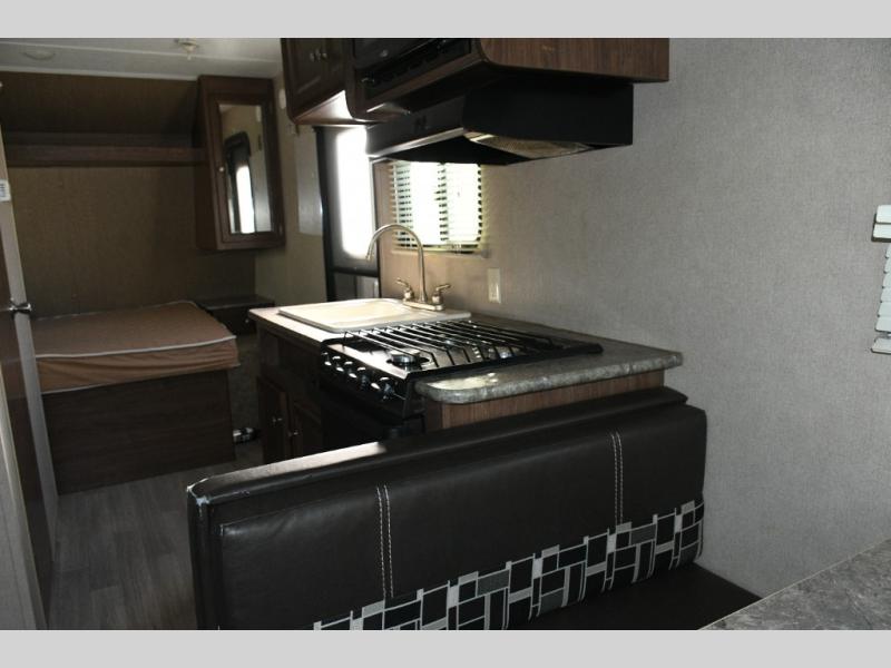 Inside, the layout maximizes comfort and convenience. The queen bed at the front includes a large storage shelf and bedside nightstand for personal items. Across from the entry, the kitchen area offers all the necessities, including a double sink, three-burner range, refrigerator, and pantry. The bathroom is full-size with a tub/shower combo and overhead medicine cabinet. The rear of the trailer features a sofa and booth dinette, each with overhead storage and convertible into sleeping areas for guests.