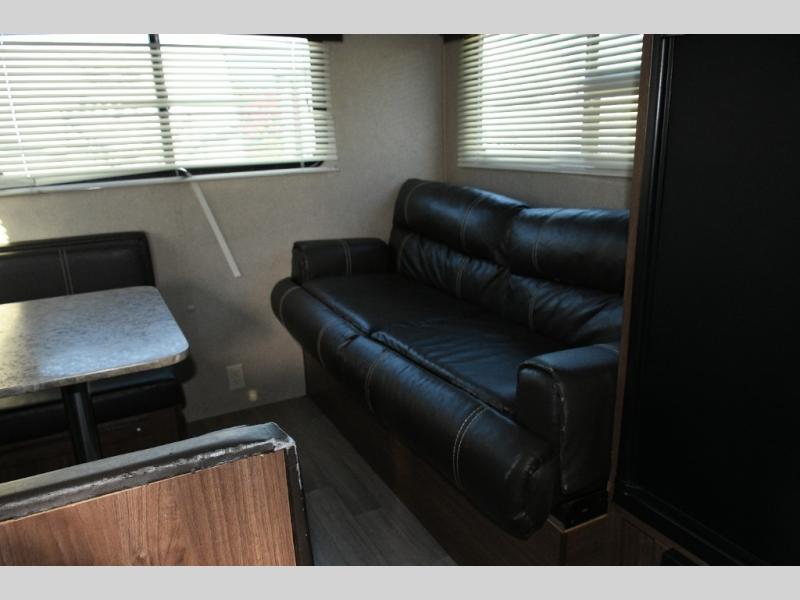 The rear of the trailer features a sofa and booth dinette, each with overhead storage and convertible into sleeping areas for guests.