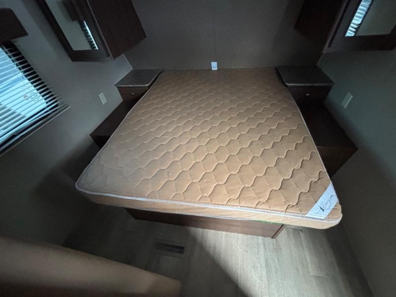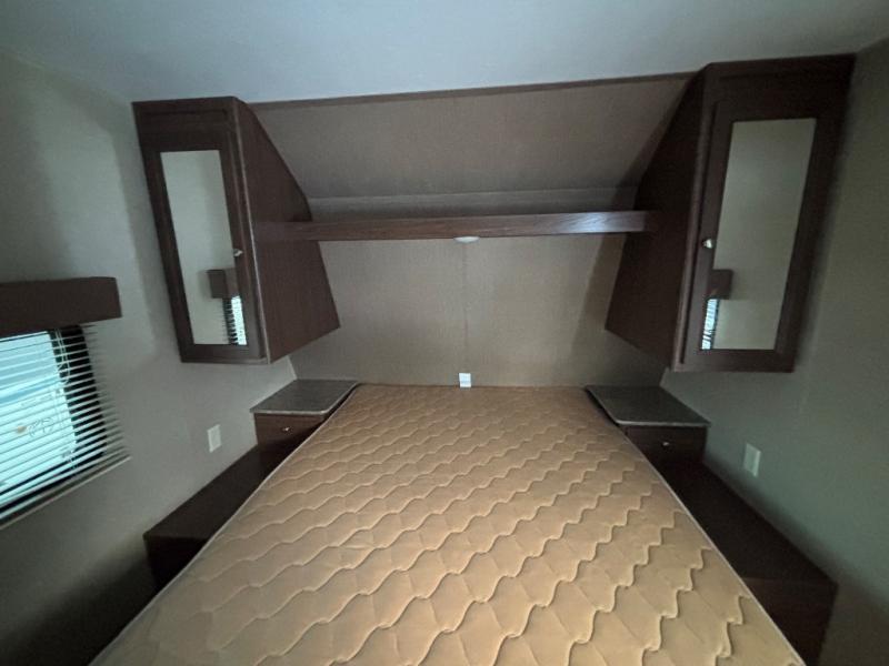 Heading towards the front, the bedroom includes a queen bed with an overhead shelf, and dual nightstands with shirt closets above.
