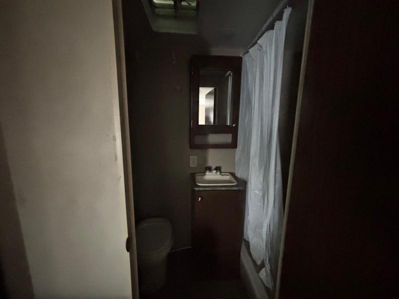 The rear bath includes a shower, sink, toilet, and wardrobe with drawers.