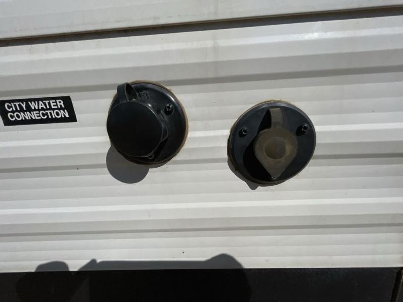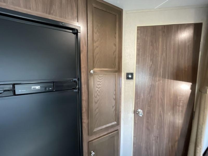 The rear left corner features a convenient full bath providing a shower, toilet, and sink plus the second entry/exit door to the trailer. In the rear right corner is a set of double size bunks with enough space for four people to sleep comfortably.