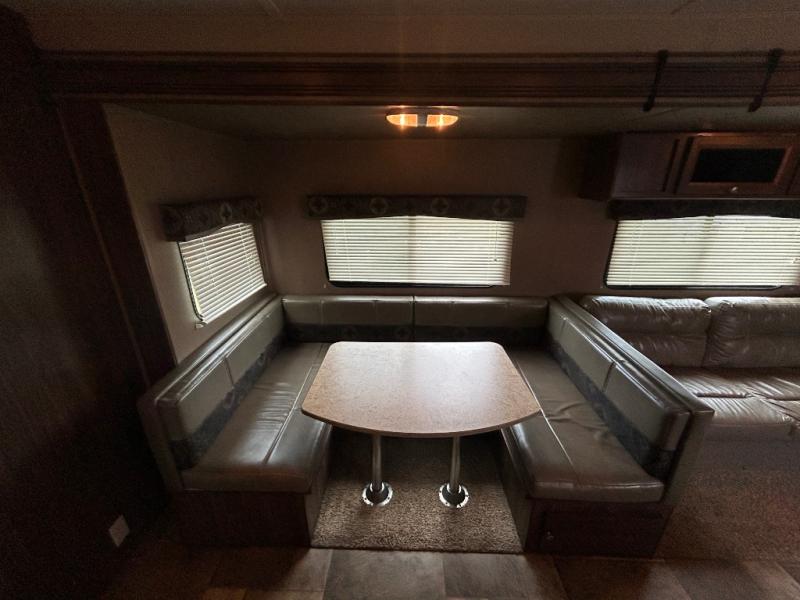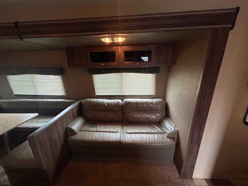 The slide out sofa and u-shaped dinette offer much seating in the living area. The sofa features storage above, and both can be made into sleeping space at night easily.