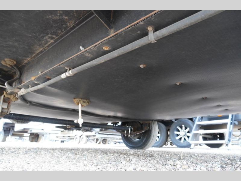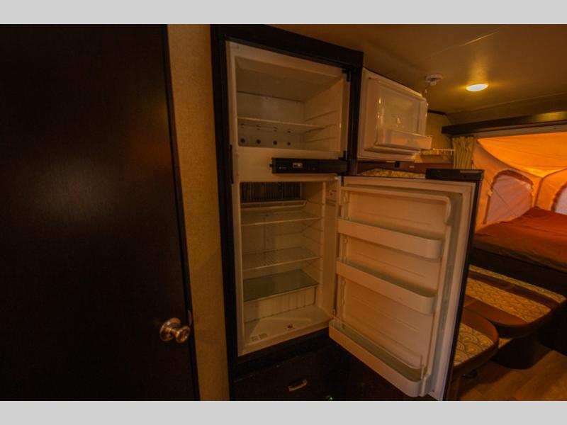 To the right of the door you will find a convenient double sink for kitchen cleanup, a three burner range with microwave oven, and an overhead cabinet for storage. The refrigerator is located along the opposite side of the room next to the booth dinette that is 40" x 74". The dinette table can be folded down to create more sleeping space if needed.