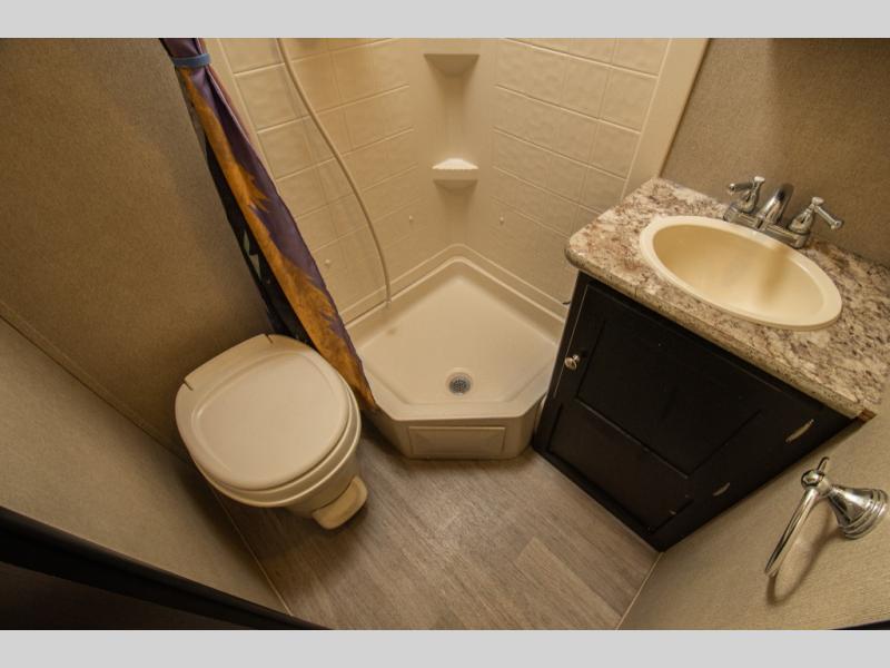 As you enter the main door there is a full bath straight ahead which features a 27" angled shower, toilet, and sink with overhead cabinet for your things.