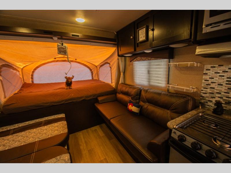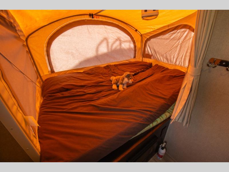 This Kodiak Express expandable 172E by Dutchmen RV features front and rear tent end beds for sleeping. Each have a storage shelf above as you enter the tent end bunk.