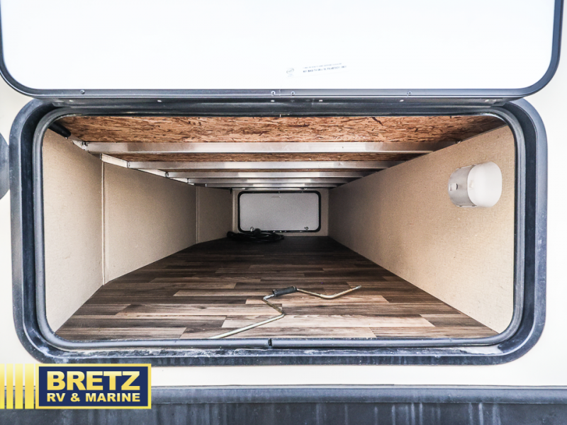 The front side entry leads you into the living space with a bedroom up front on your right. There is an entertainment center just off the foot of the bed that features sliding doors on either side that allow you to close off the space for more privacy at night. Inside the bedroom enjoy a queen size bed, dual bedside wardrobes, an overhead shelf, and more!