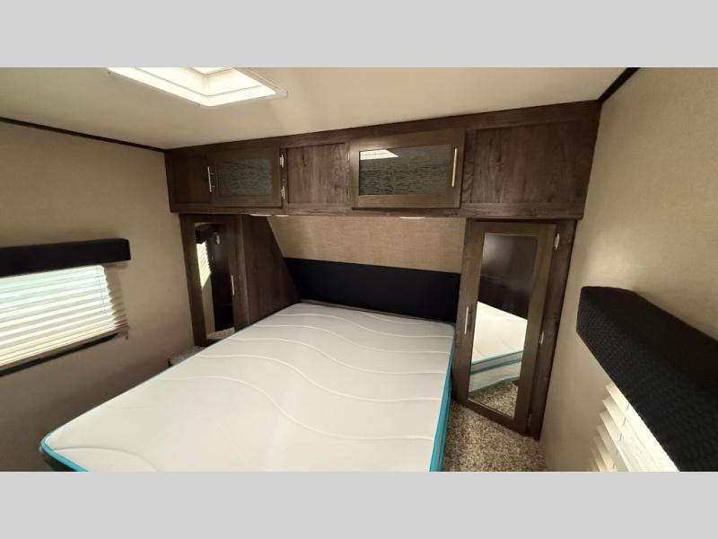 The front bedroom includes a queen bed with dual wardrobes and overhead cabinets.