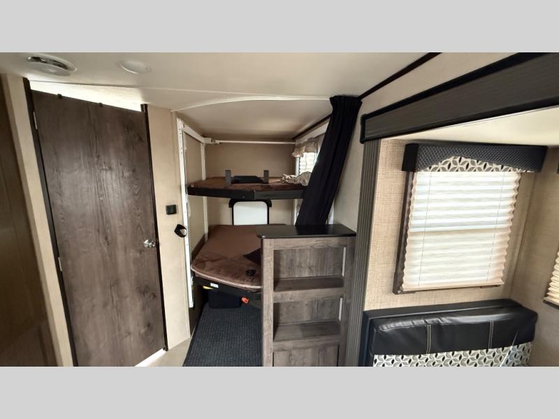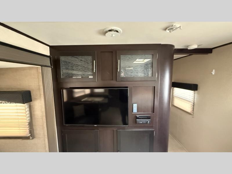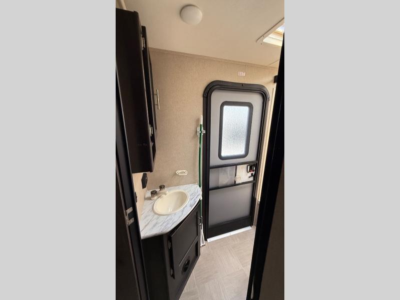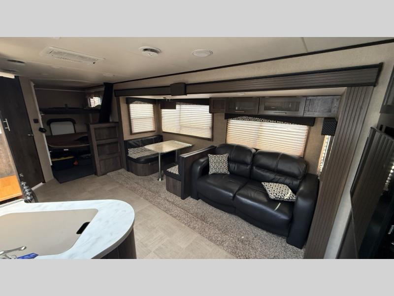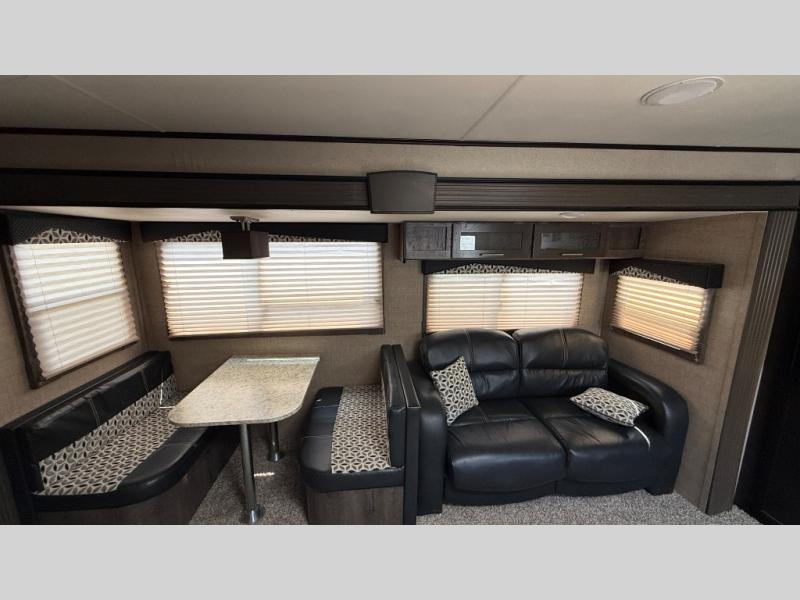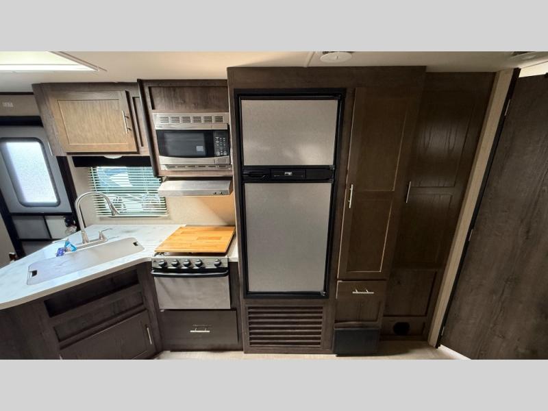 Enter through the main door and find yourself in the kitchen and living area. To the left of the entrance there is an angled double kitchen sink, three burner range, microwave, refrigerator, pantry, and a wardrobe. On the opposite side of the trailer the slide has a jack knife sofa, booth dinette, and overhead cabinets. Adjacent to the slide is an entertainment center for easy viewing.