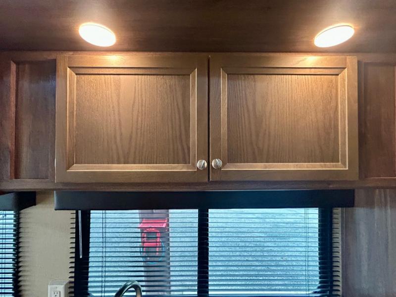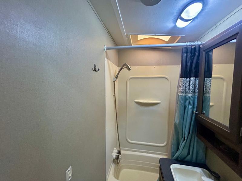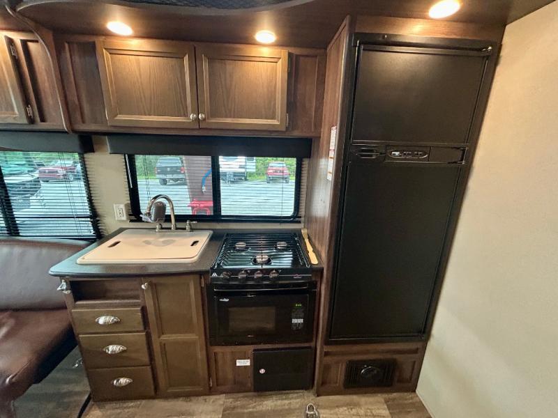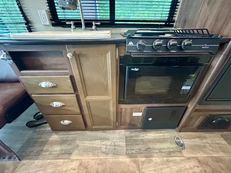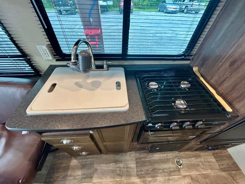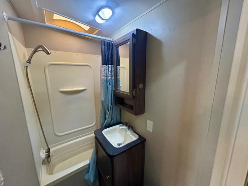 The kitchen is centrally located and includes a double sink, three burner stove top with microwave oven, overhead cabinets and a refrigerator. You will have no problem cooking up meals and snacks to keep everyone on the go.