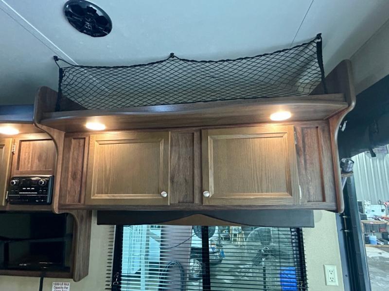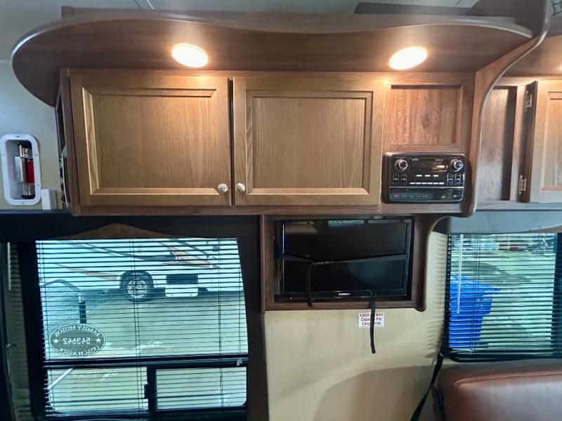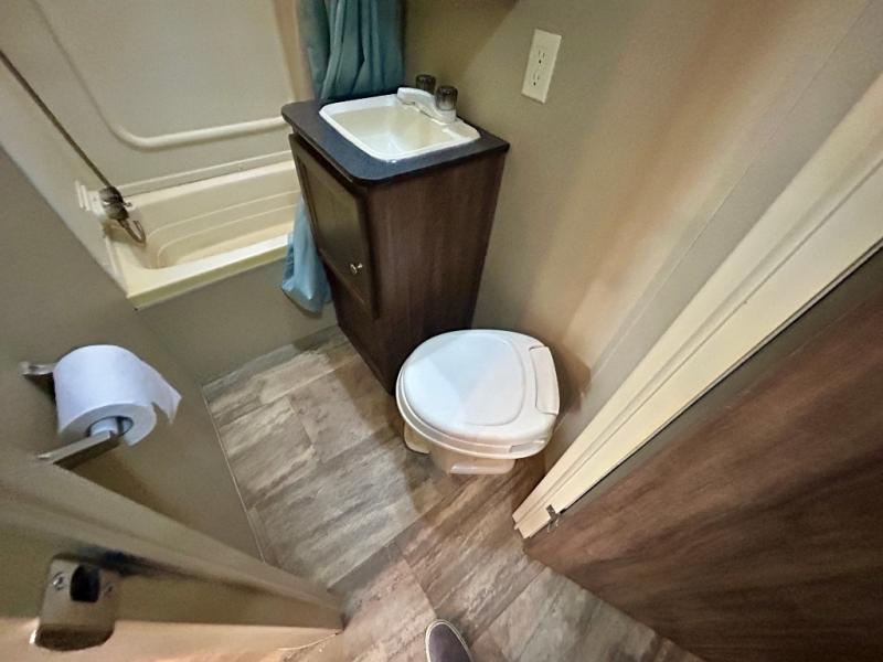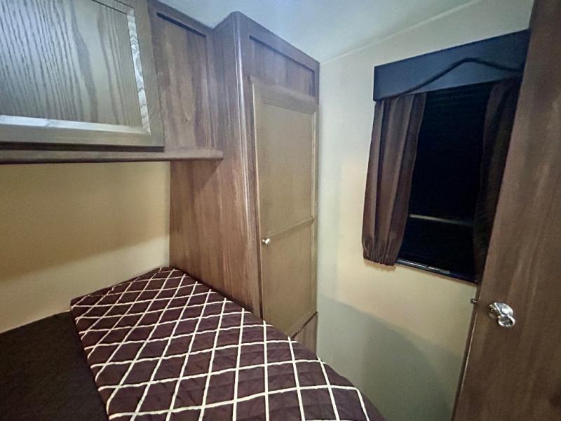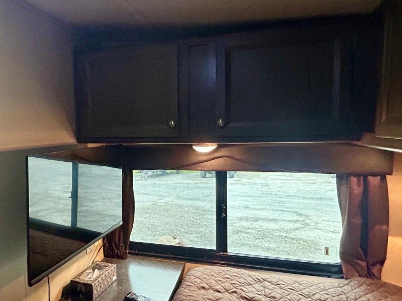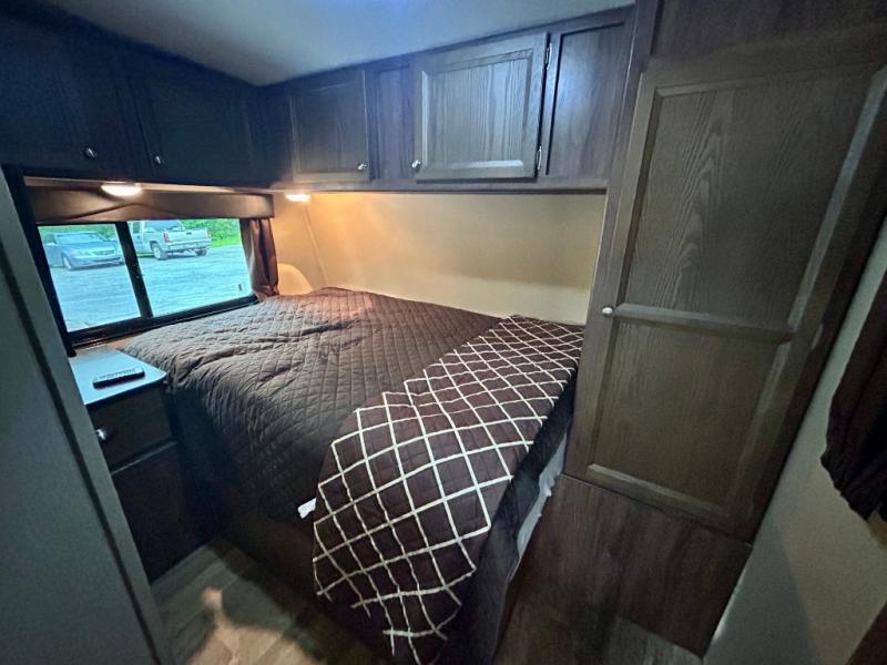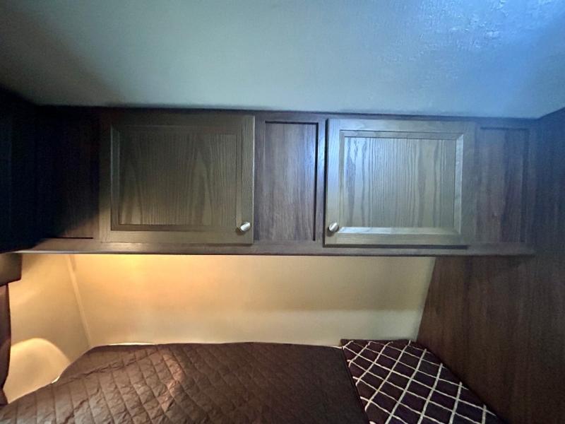 The front bedroom includes a corner queen size bed with a wardrobe at the foot of the bed. There are overhead cabinets along the front side of the bed and a portion of the headboard along with a nightstand for more storage. There is also a TV location opposite the bed just inside the door if you choose to add, plus more!