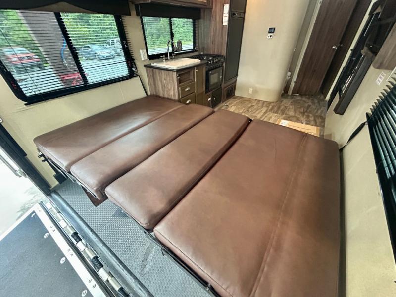 The Rubicon 2100 toy hauler travel trailer from Dutchmen includes a 7' rear ramp door with spring assist offering 12' 3" of cargo toy parking space. Inside the rear cargo area you will find two sofas and a fold away dinette for eating or just hanging out once the toys have been moved outside. Overhead cabinets are plentiful in this toy hauler and you will enjoy the radio, TV and DVD player in your down time. For a bit more seating you may choose to add an optional lounge chair as well.