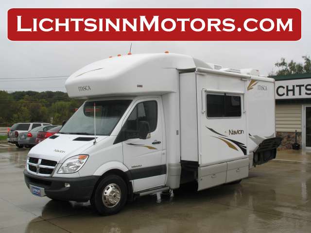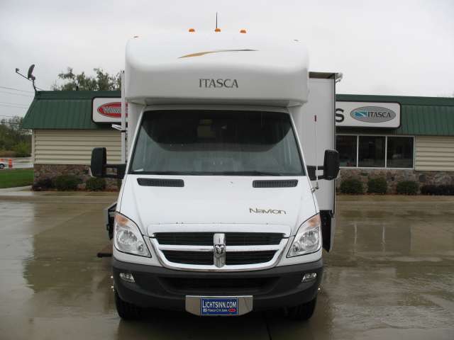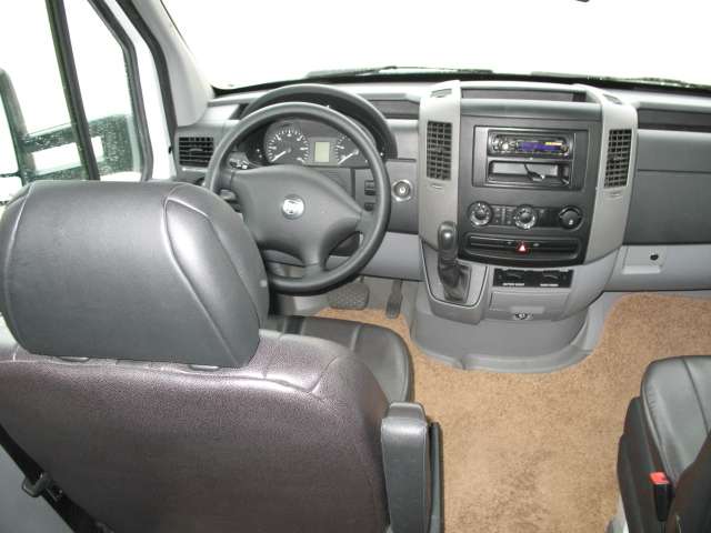 Once inside notice the large slide out reclining sofa seating lounge with stowable table. There is a corner storage cabinet just before the steps that lead up to the front master bedroom and bath.