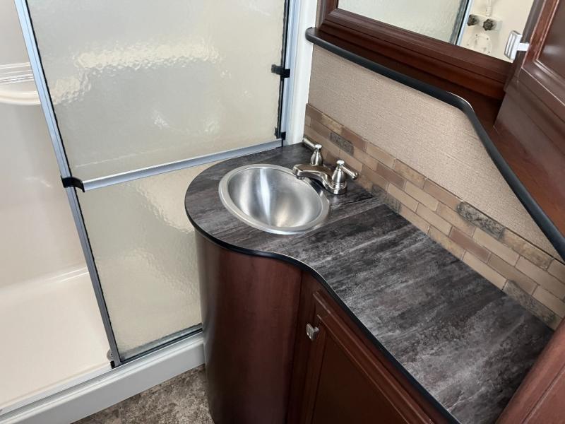The 8' spring assist rear ramp door will make loading and unloading a breeze into the 11' cargo space provided. There is a 40" x 88" twin loft bed, and a 32" TV overhead cabinet in the cargo, plus a convenient half bath as well.