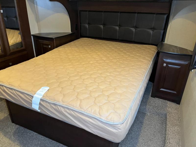 Continue down the hall to the front private bedroom with sliding pocket door. There is a queen bed with storage including nightstands on both sides of the bed. You will also find a slide out wardrobe and a 32" TV, plus overhead cabinets.