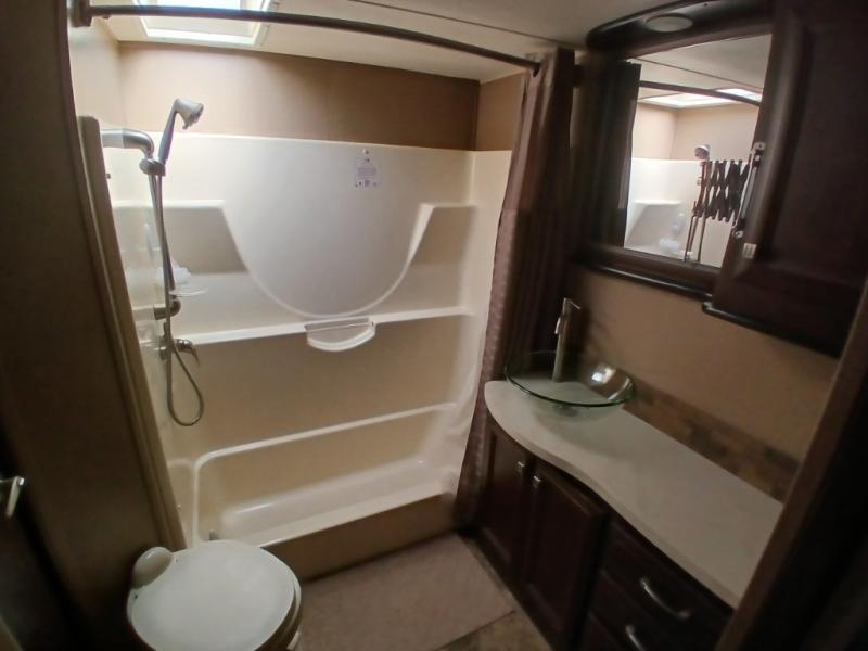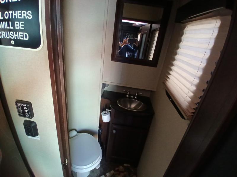 The cargo area features a twin bed loft that can overlook the main living and kitchen area of the unit. A 32" TV and stereo makes this space a lot of fun. There is also overhead storage on both sides of the cargo space along with a convenient half bath located in the front of the cargo area too.