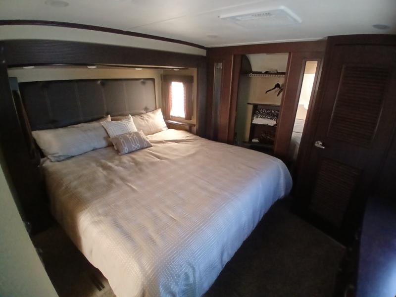 The front master bedroom features a king size bed slide including nightstands. There is a dresser with TV, overhead storage, a large wardrobe/closet, and a second closet with washer/dryer prep.