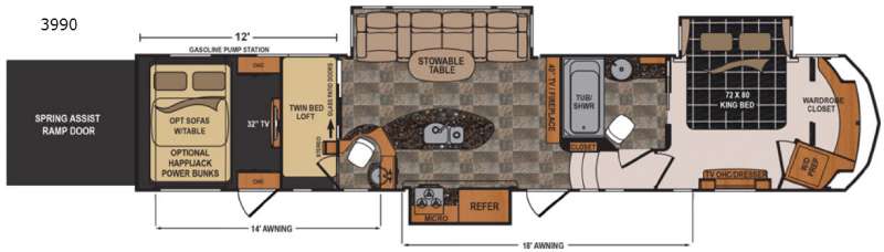 You have a 30 gallon gasoline fuel pump station outside so that the fun can last all weekend long. Plus, there is a 14' awning off the cargo area door, and an 18' awning off the main side entrance, plus so much more!