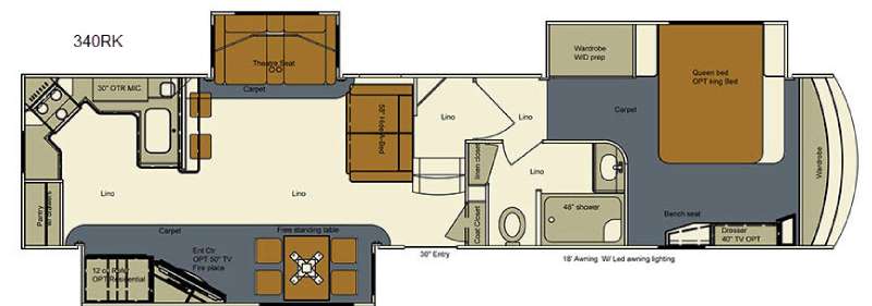 A slightly different floor plan is available with a stainless steel refrigerator located along the rear wall, and a large pantry closet is on the slide in place of the refrigerator. The theater seats include recliners, and in place of the hide-a-bed there is a swivel recliner. The bedroom does not include the bench seat or the optional TV.