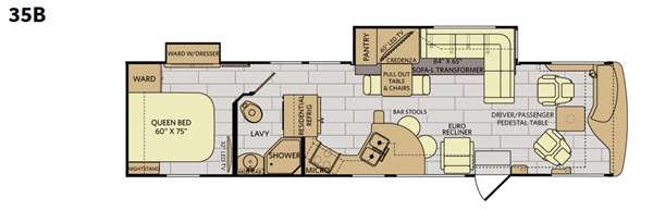 Stepping inside the 35B Excursion motor home by Fleetwood, you will see that they have used every bit of space to make this model ideal for you. To the left of the entrance is an Euro recliner, a curved counter with bar stools, a double kitchen sink, three burner range, microwave, and residential refrigerator. Behind the drivers seat is a l-sofa, pull out table and chairs, 40" LED TV, and pantry slide.