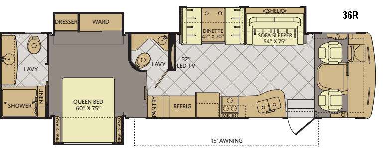 Enter the master bedroom and be amazed at the spacious retreat. You will find here a queen bed slide out including nightstands on your left, and a slide out dresser and wardrobe on your right. The very rear of this unit features a master bath which includes a shower, linen cabinet, toilet, and vanity with sink.