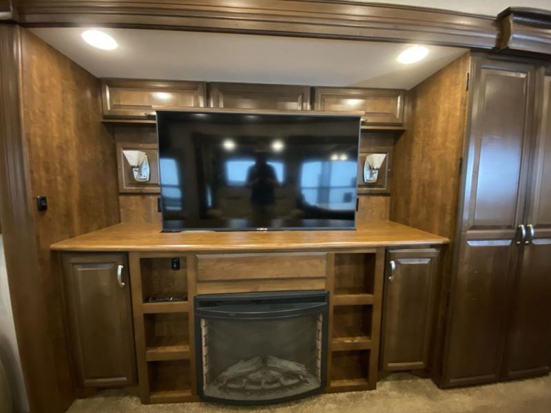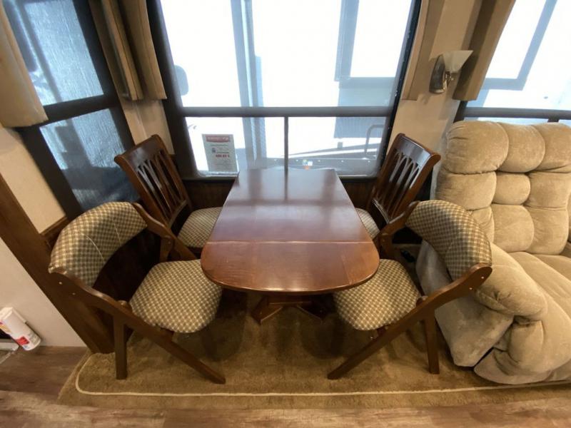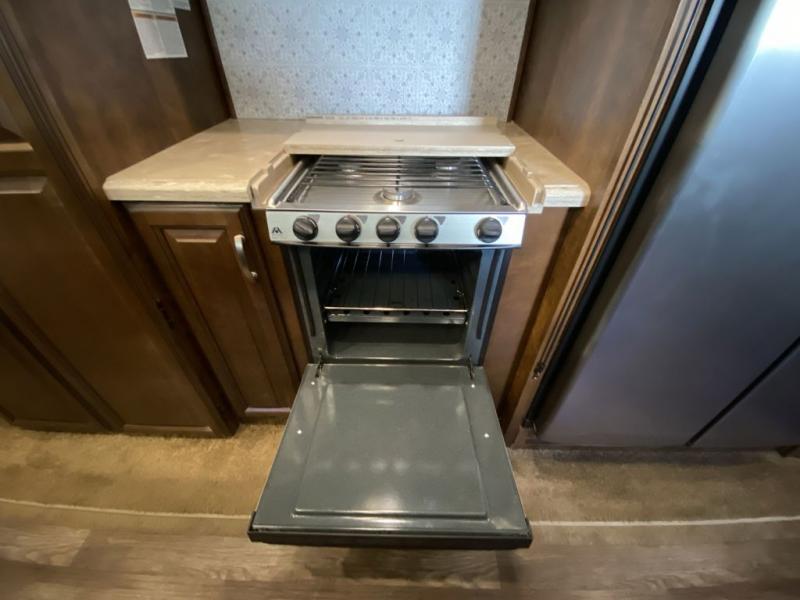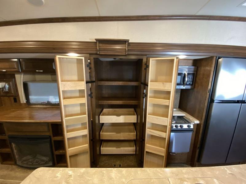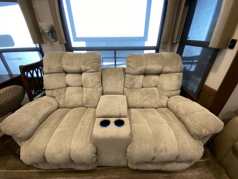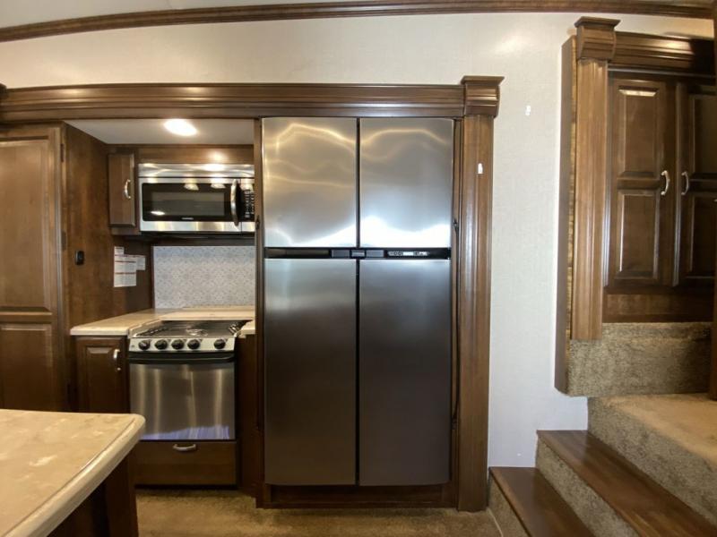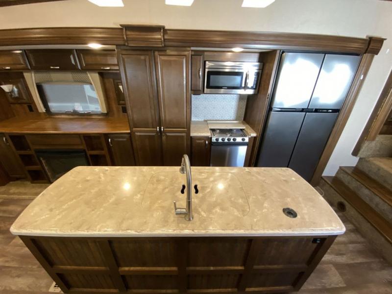 As you enter the fifth wheel, to the left is a slide with a free-standing dinette, and two recliners or you can choose optional theater seats. Along the rear wall there is a sofa hide-a-bed. The other slide has a 58" pop-up TV with a fireplace below the TV, pantry, microwave, three burner range, additional pantry, and a refrigerator. There is also a kitchen island with a double kitchen sink.