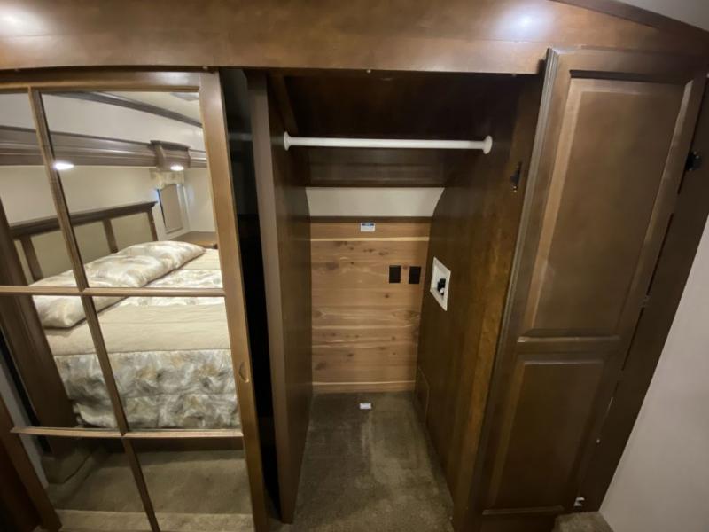 The bedroom has a slide with a wardrobe, nightstand, and king bed. There is also a wardrobe with shelves, washer/dryer prep, drawers.