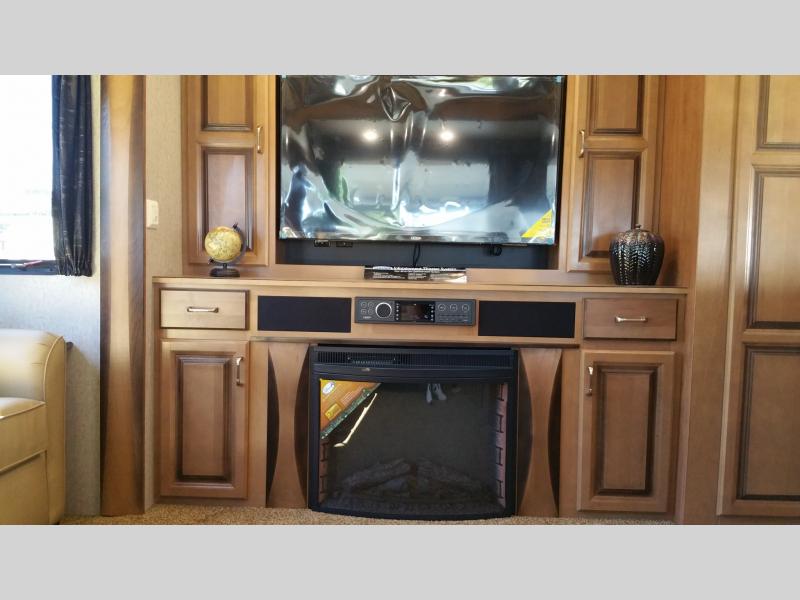 As you enter the fifth wheel, to the left is a slide with a table, and two lounge chairs. Along the rear wall is a sofa. The other slide has an entertainment center, fireplace, desk, pantry with drawers, three burner range, microwave, additional pantry, and refrigerator. You are also sure to enjoy the kitchen island with the double kitchen sink and an optional dishwasher. There is a closet near the entry.
