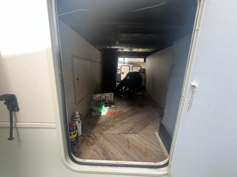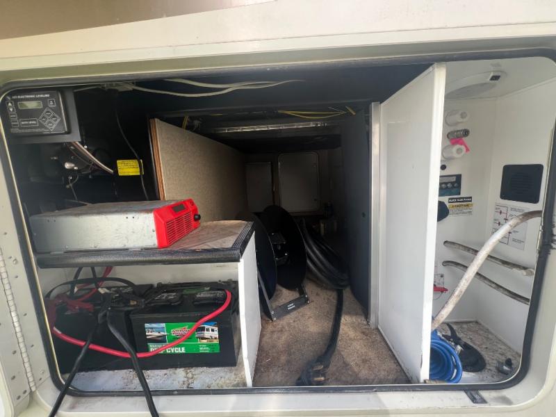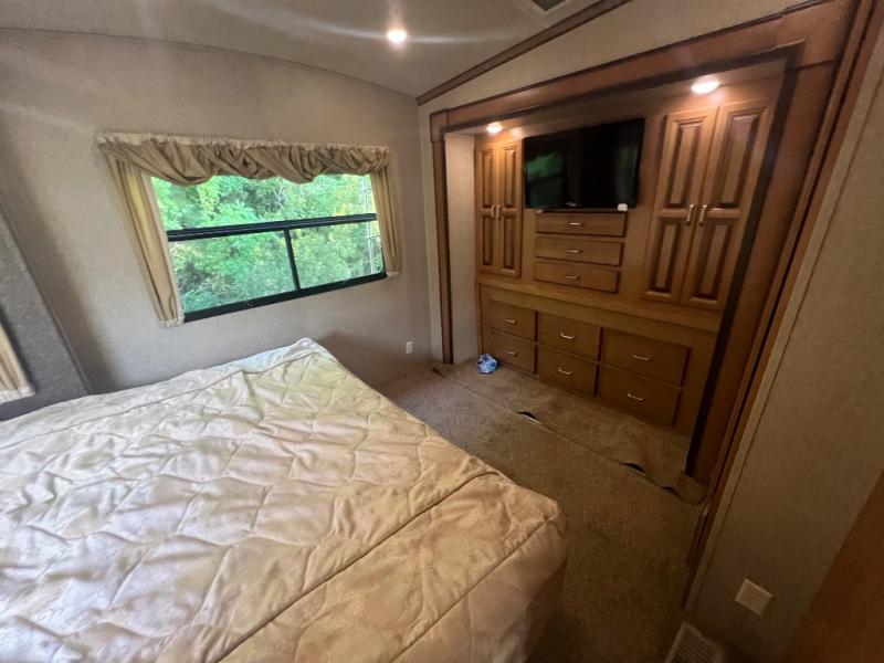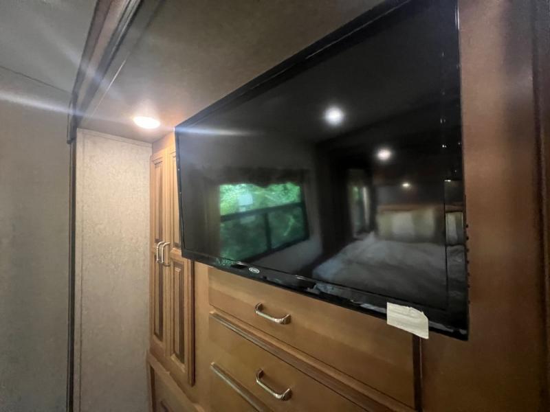 - Private master bedroom with slide-out queen bed, TV mount area, and wardrobe storage