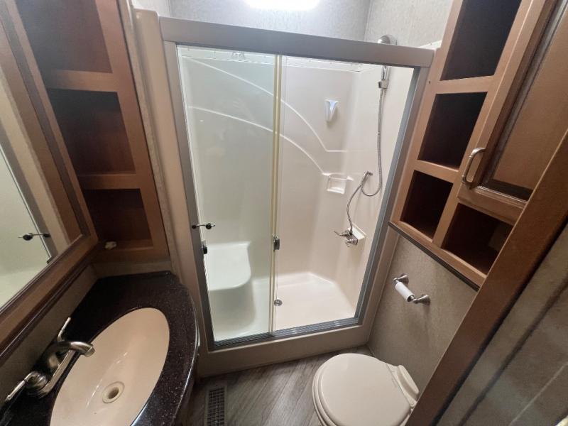- Side aisle bath with residential shower, vanity, medicine cabinet, and overhead storage
