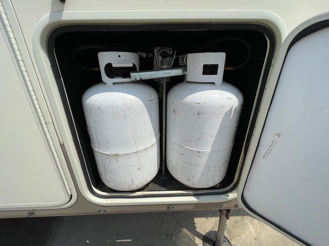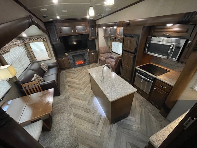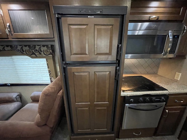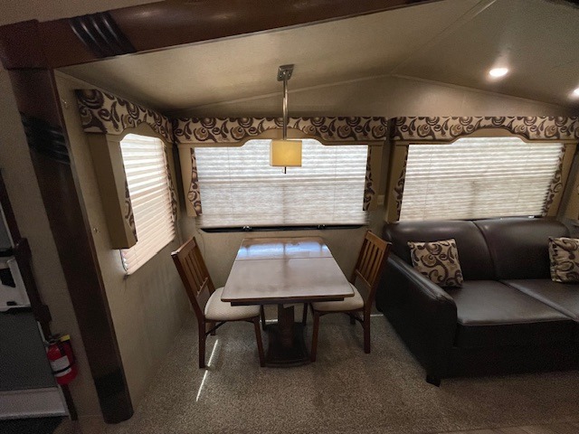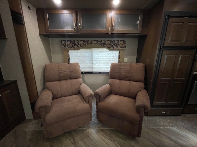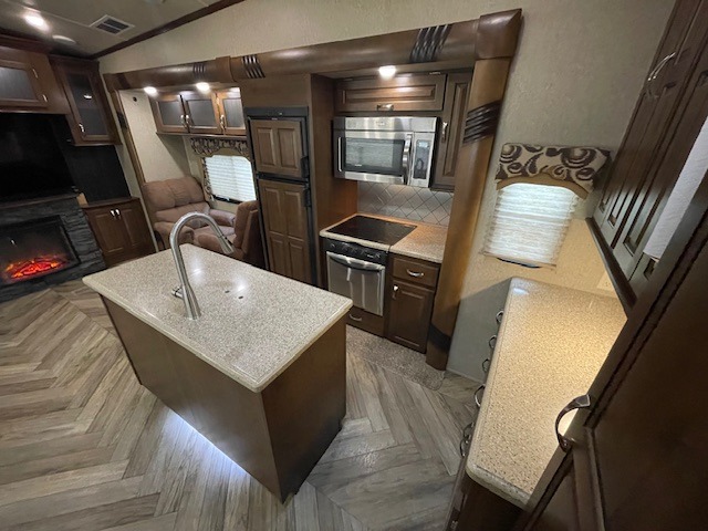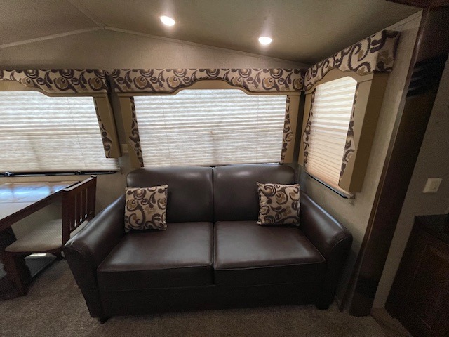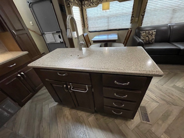 Step inside model 29IK and find to your left a slide out free-standing table with chairs along with a sofa. The rear wall offers a full entertainment center for your enjoyment. There is another slide with two lounge chairs, plus the kitchen appliances that include a refrigerator, a microwave, and three burner range. The kitchen also has a an island where you will find a double sink, and lots of counter space for food prep and serving.