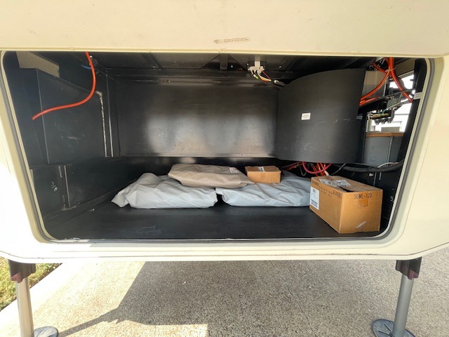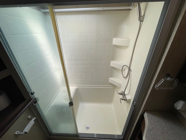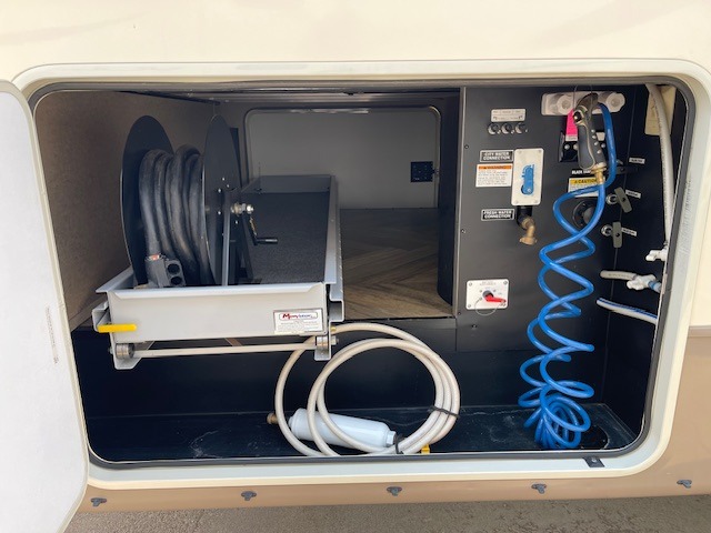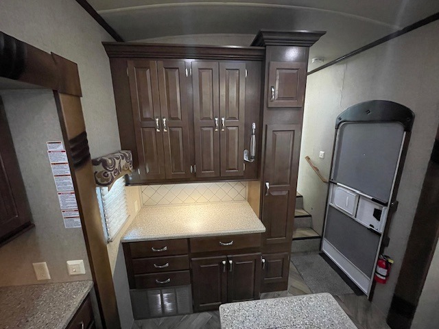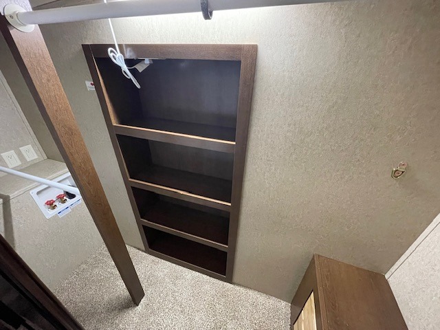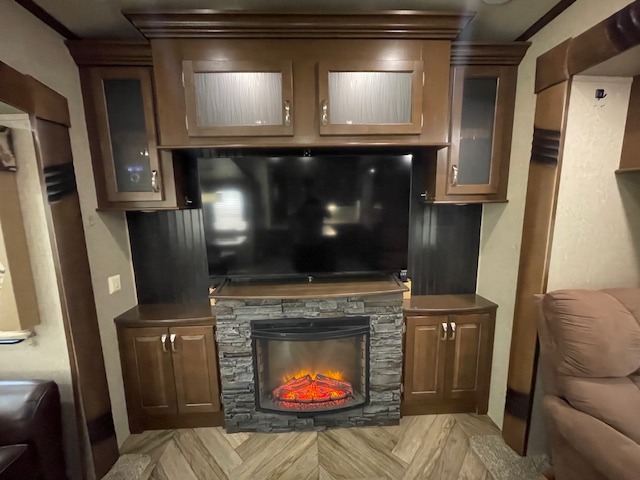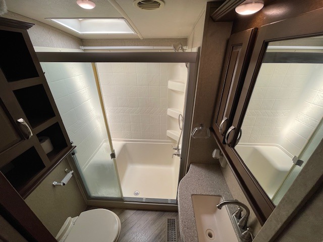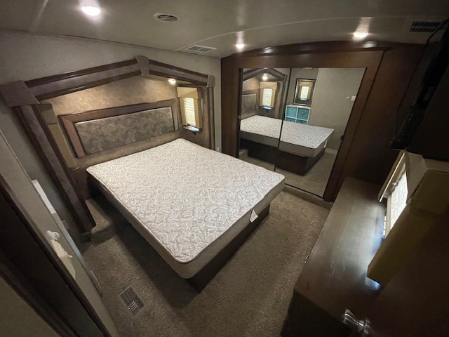 In the bedroom there is a queen bed slide with shelves on either side, or you can choose an optional king size bed if you like a bit more sleeping space. There is much storage with the front wardrobe. Across from the bed you will find a dresser with a TV above it. Also in the wardrobe a portion has been prepped so you can choose to add the convenience of a stackable washer/dryer if you'd like. There are also shelves, drawers, and more!