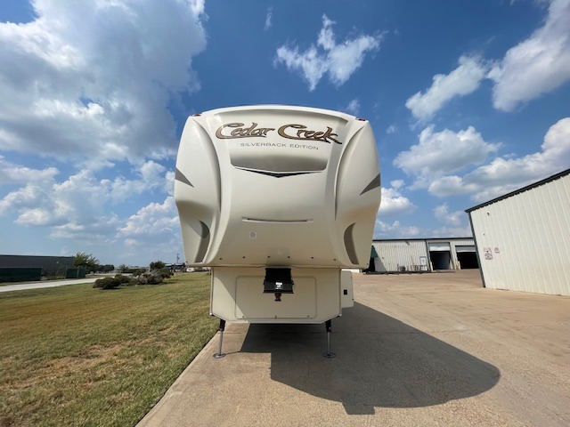 The Cedar Creek Silverback 29IK fifth wheel by Forest River offers triple slides with the opposing slides in the main living area cathedral ceiling height, plus this unit also features a rear entertainment layou, and more.