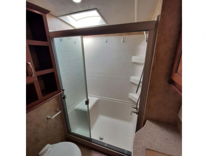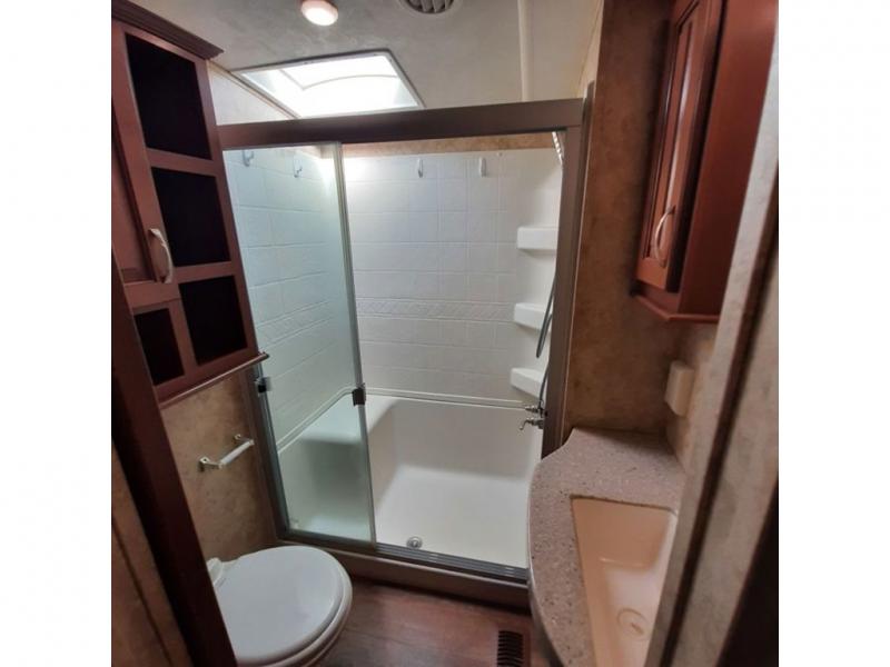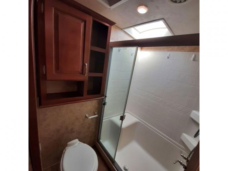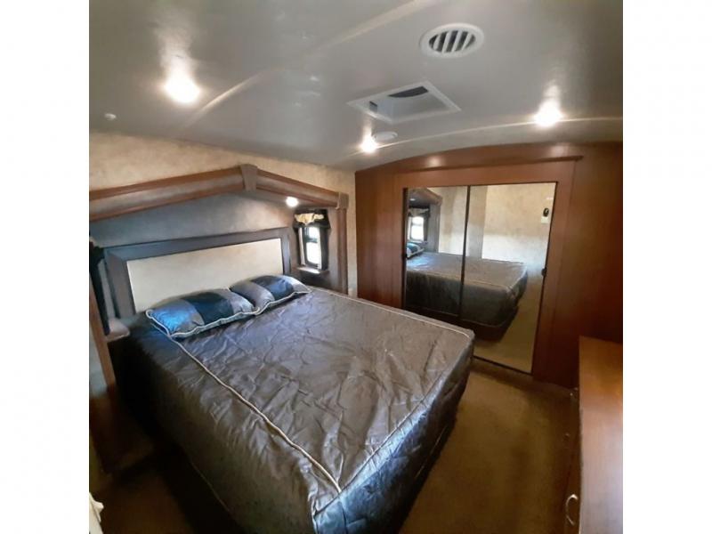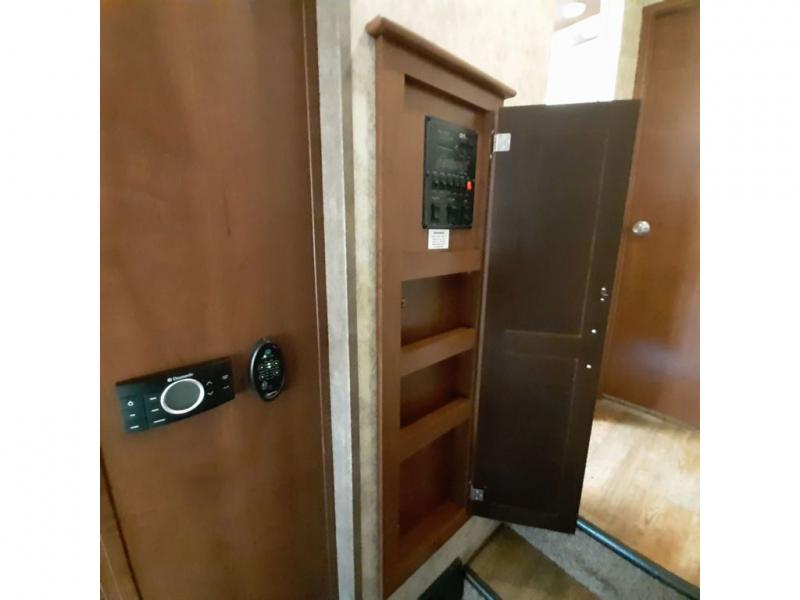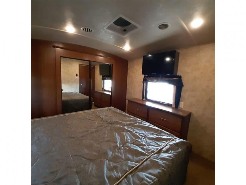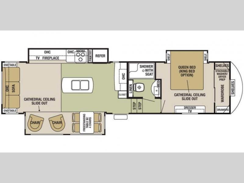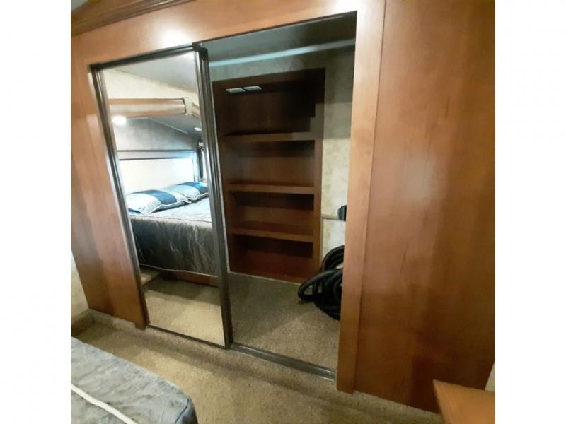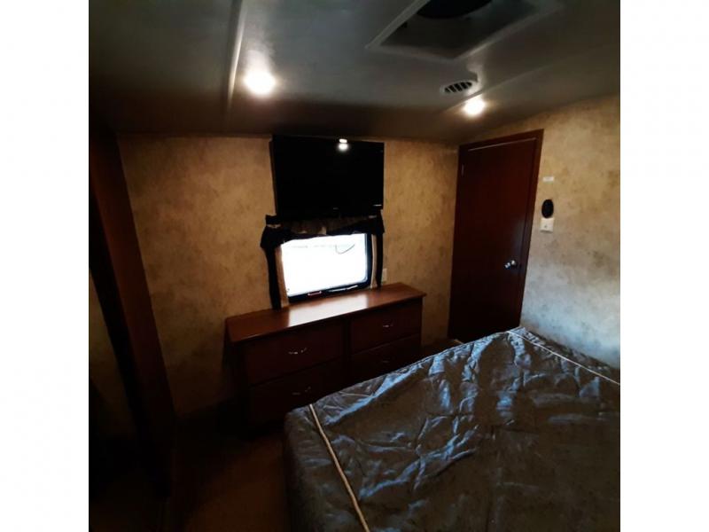 In the front bedroom there is a queen bed slide, or you can choose an optional king if you wish. This slide features a cathedral ceiling like the curb side slide in the main living area. Across from the bed there is a dresser with TV, and along the front wall you have plenty of storage with a full wardrobe. The wardrobe is even prepped for a stackable washer/dryer, and there are shelves on one side and drawers on the other, plus so much more!