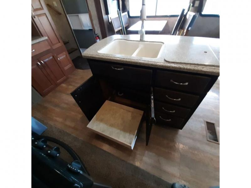 Step inside and see how much space there is to enjoy with dual opposing slides in the main living and kitchen area. To the left of the entrance there is a slide with a free-standing dinette and four chairs. Along the rear wall you will find a sofa with end tables on either side, plus more storage overhead. There is another slide with a TV, fireplace, and the kitchen appliances that includes a three burner range, microwave, pantry, and refrigerator. Along the front wall of the kitchen area you will find extra counter space and a closet. The island also offers added counter space, which you are sure to enjoy for meal prep, as well as a double kitchen sink.