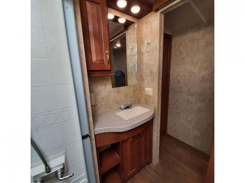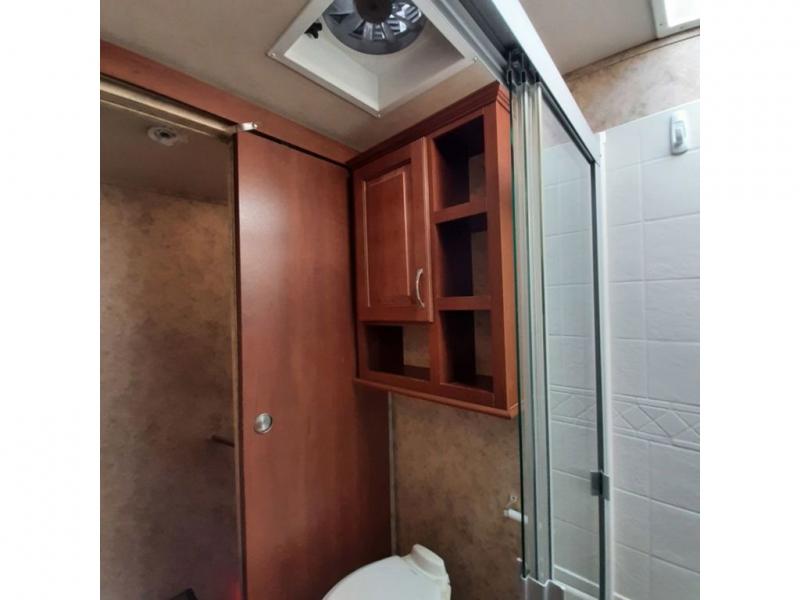 As you head up the steps to the right of the door, the bathroom is on the left. Inside the bathroom you will find a toilet, shower with seat, sink, and medicine cabinet.