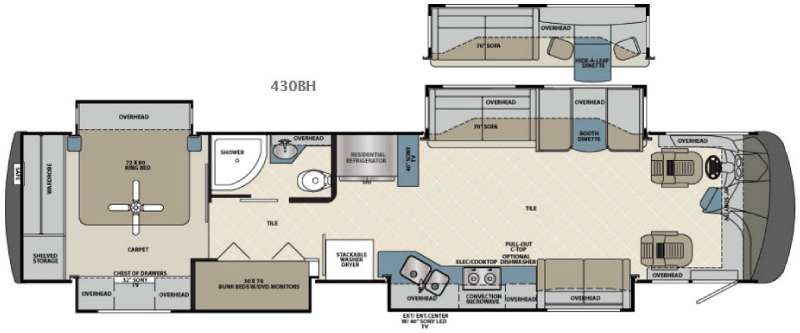 You will be wowed with the 430BH Charleston class A diesel motor home by Forest River featuring quad slides, a set of bunk beds, a bedroom ceiling fan, plus so much more!