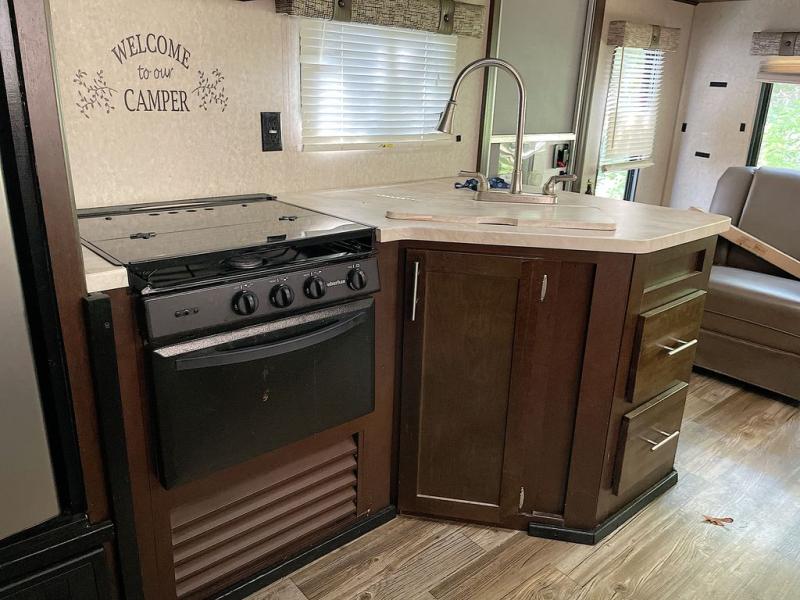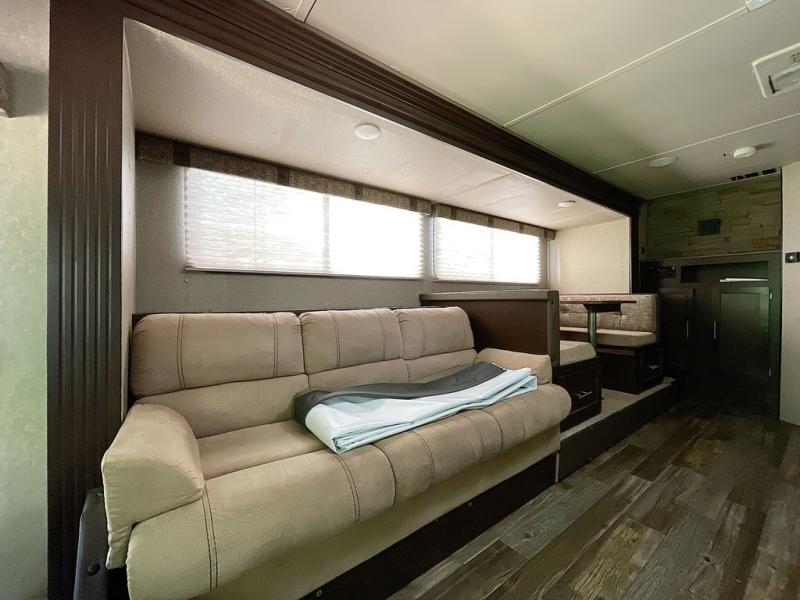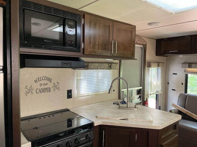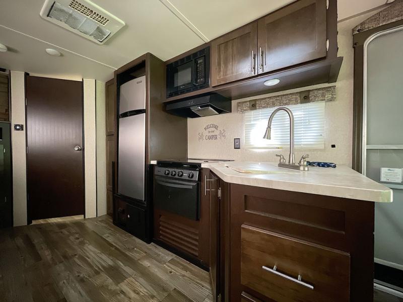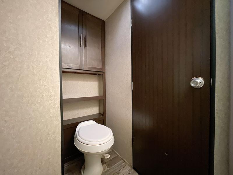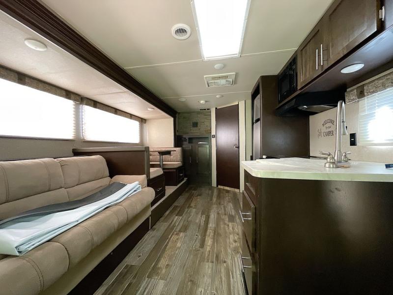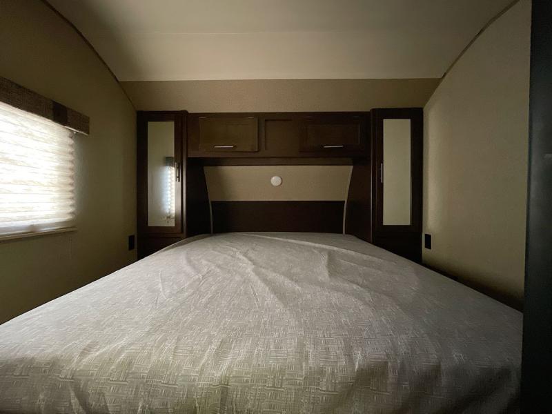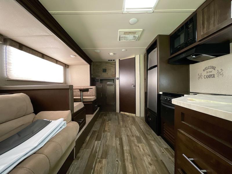 You will also find plenty of overhead cabinets throughout the travel trailer, as well as outside storage, plus so much more.