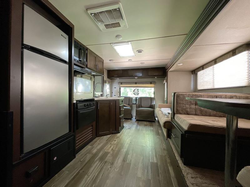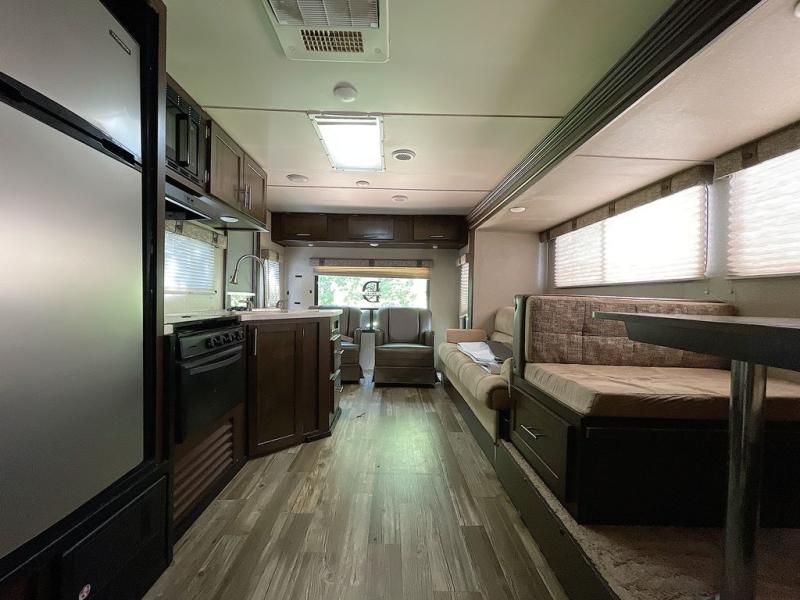 As you enter the travel trailer, there are two lounge chairs along the rear wall. The slide has a sofa and dinette. Along one wall there is an entertainment center. The other side has a large sink, three burner range, microwave, refrigerator, and pantry.