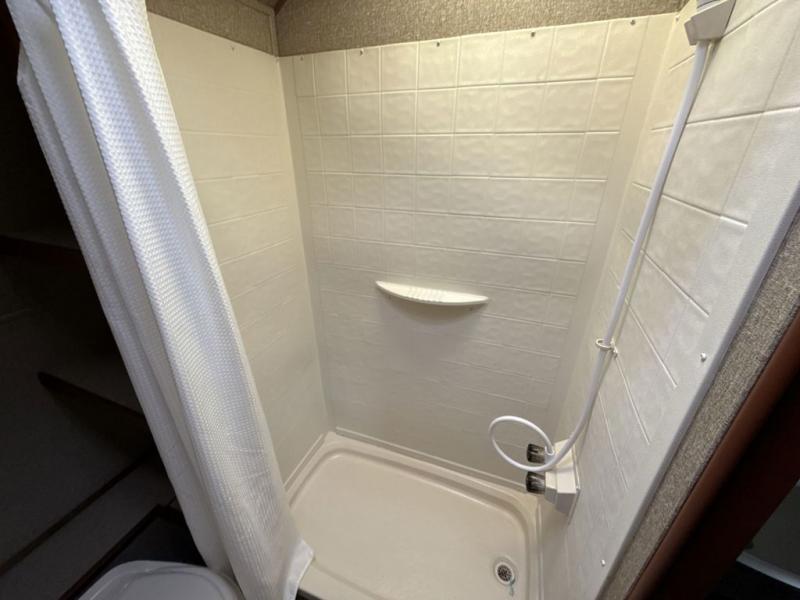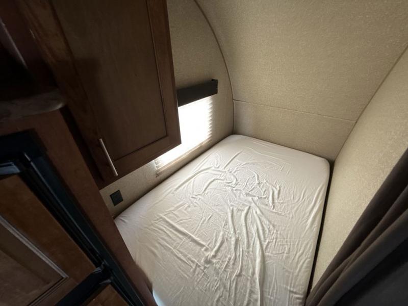 In the front of the travel trailer, you will find a double bed with a shirt closet.