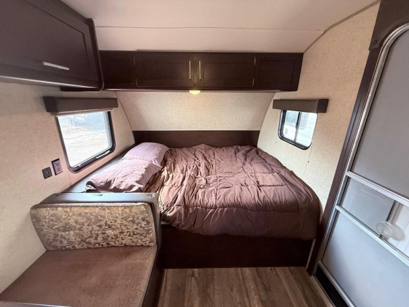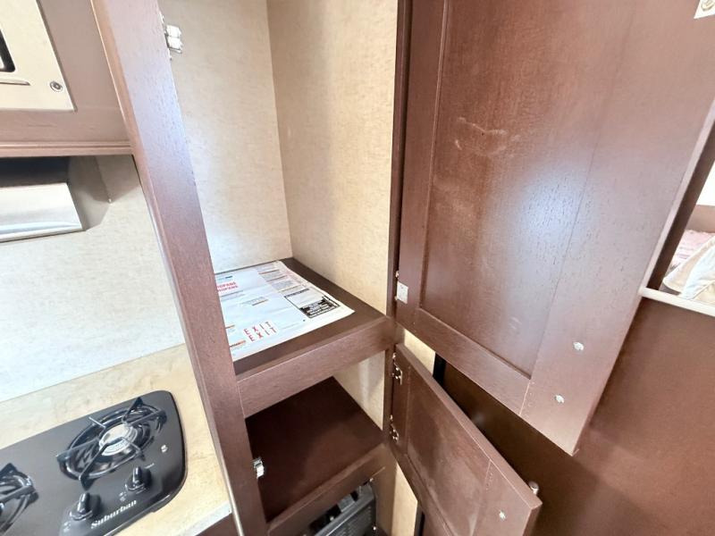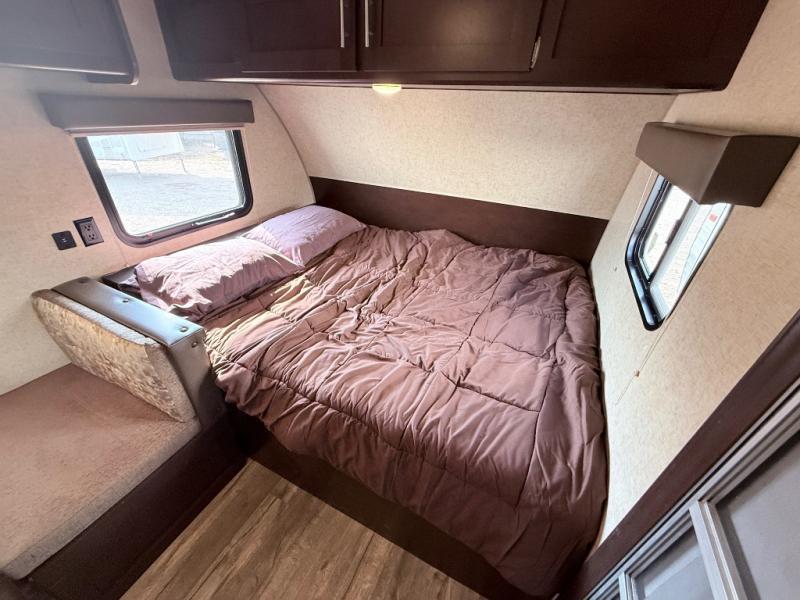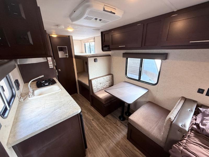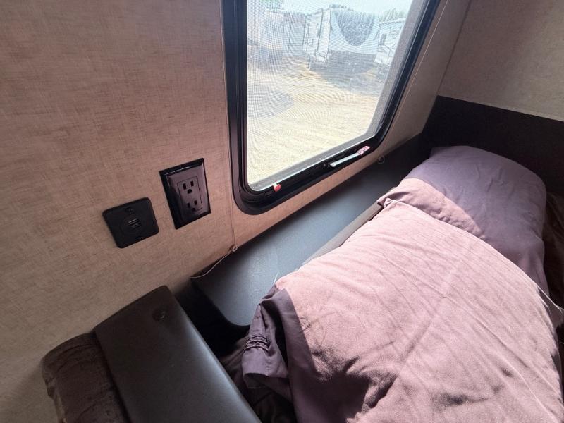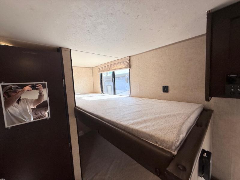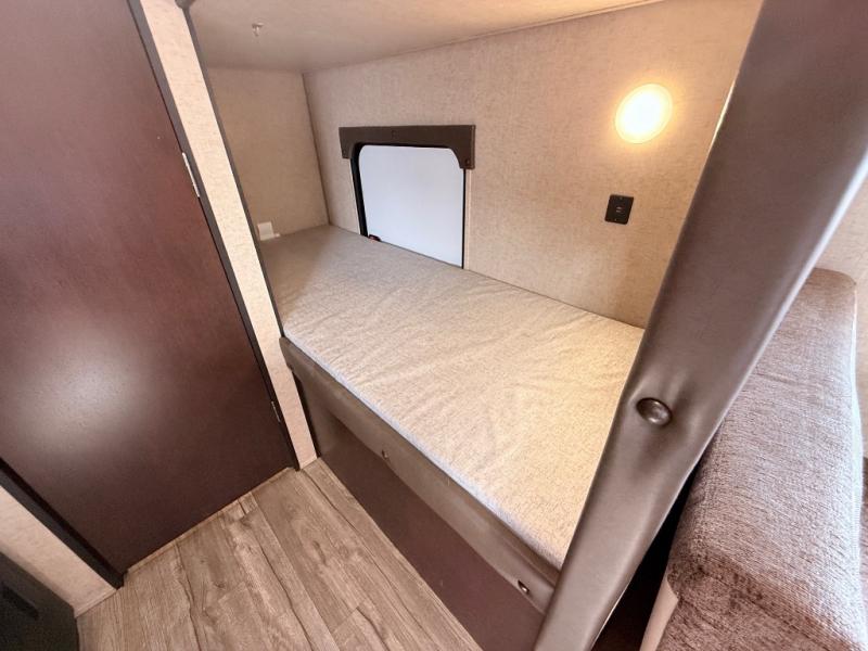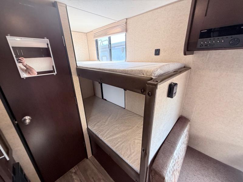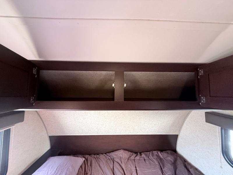 What I liked most: You can see a lot of thought has gone into this small end camper. The bunks and bed have been placed with space efficiency. The storage throughout actually has some nice depth.