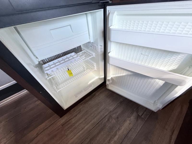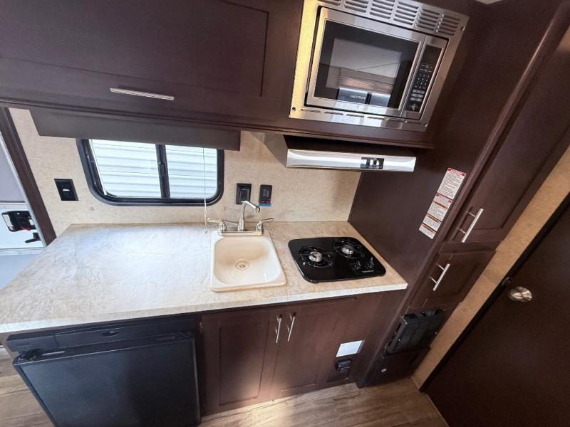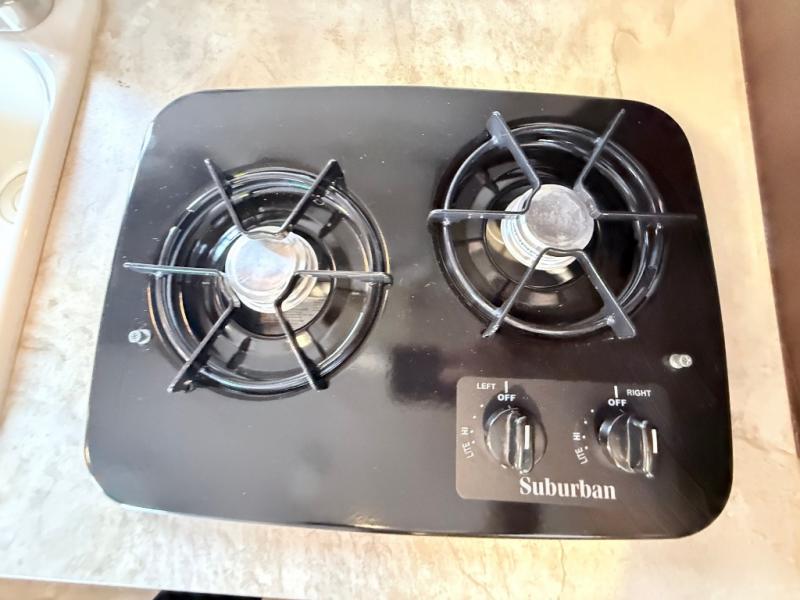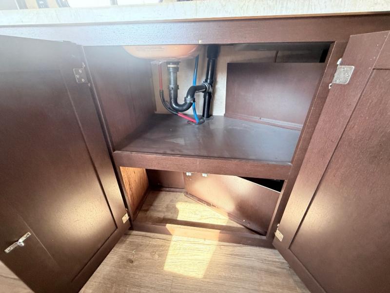 To the left of the entrance you will find a cooking area featuring plenty of counter space, a single sink, a two burner cook-top, and refrigerator for your perishables located beneath the counter. There is also a pantry for dry and canned goods, as well as storage for dishes and things.