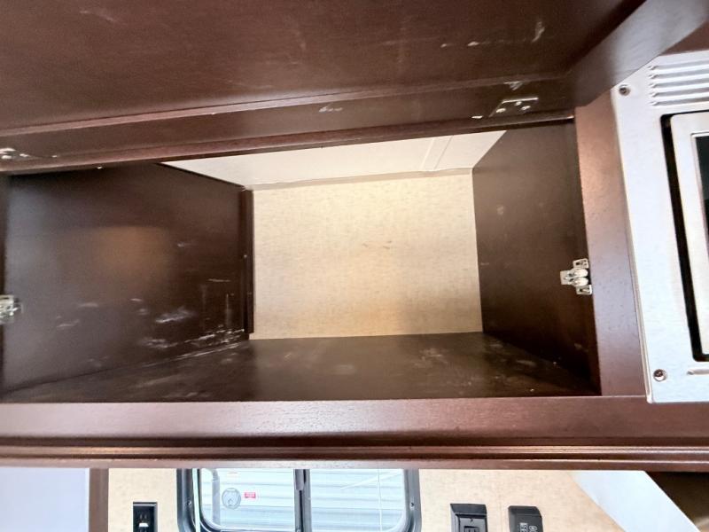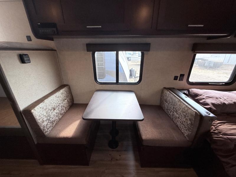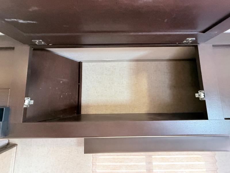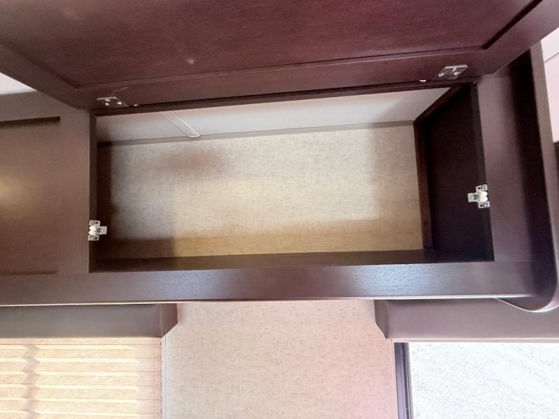 Step inside and find a queen size bed across the front with storage cabinets above two side, over the head of the bed, and along one side. The side cabinets stretch from the head of the bed along the road side wall over the dinette that is located straight across from the door.