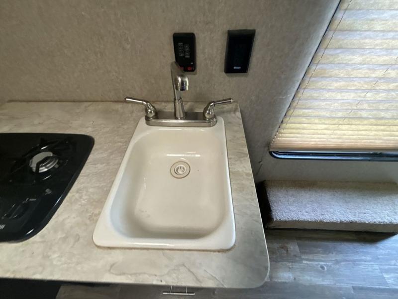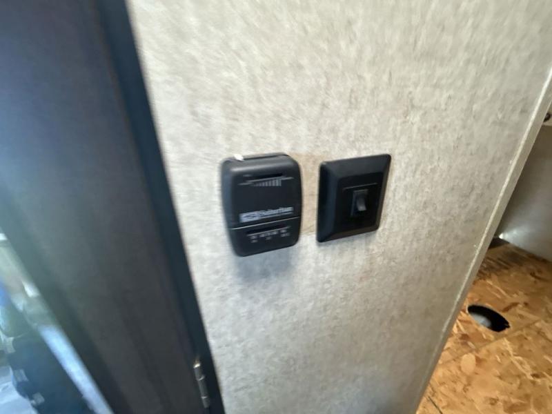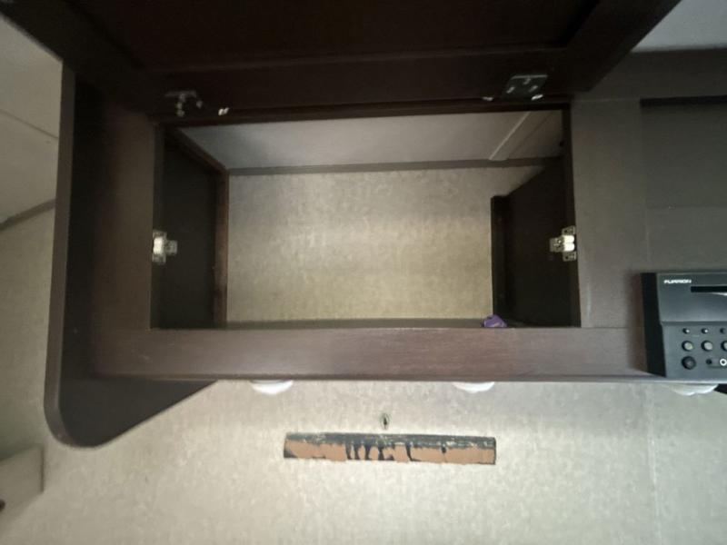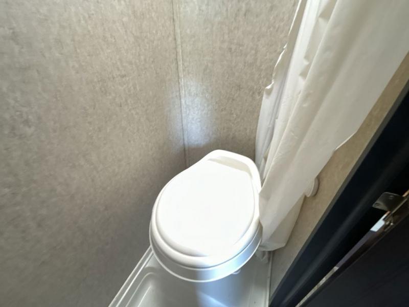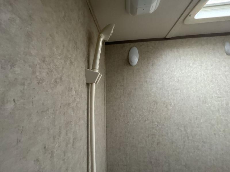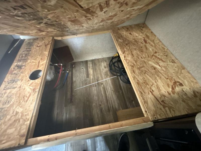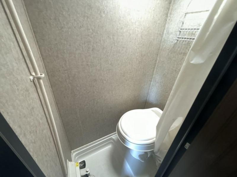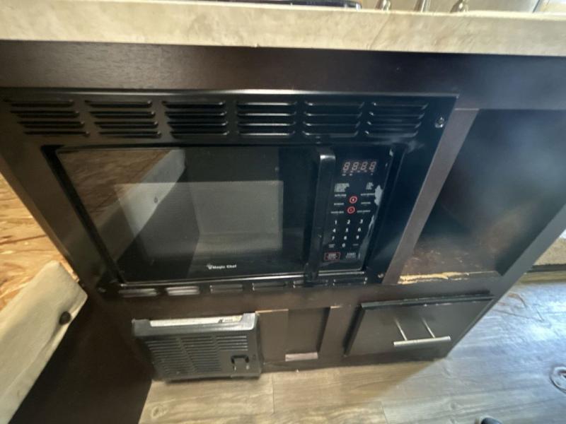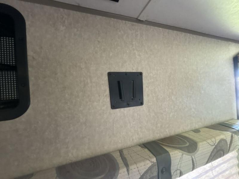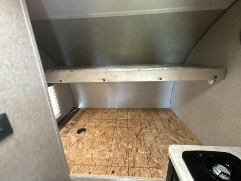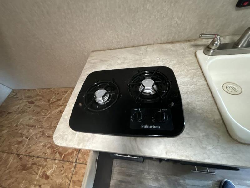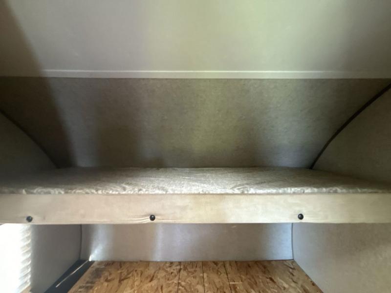 As you step into the toy hauler from the side man door, there is a removable table and rollover sofa immediately in front of you. A refrigerator and wet bath with toilet run along the far side wall. At the front you will find a 28" top bunk with a 50" bunk below. As you continue around, there is a two burner range and single bowl kitchen sink. There is also a spot for an LCD TV mount on this wall. Overhead cabinets are featured above the sofa and in the kitchen area, and much more.