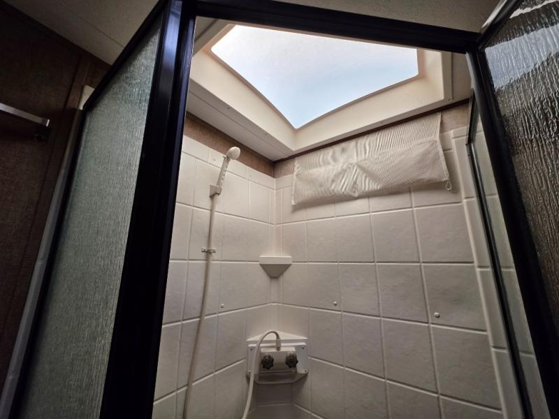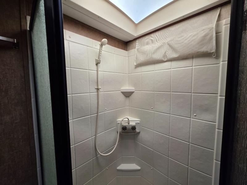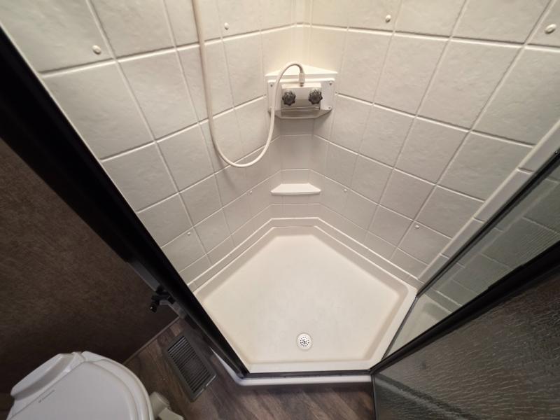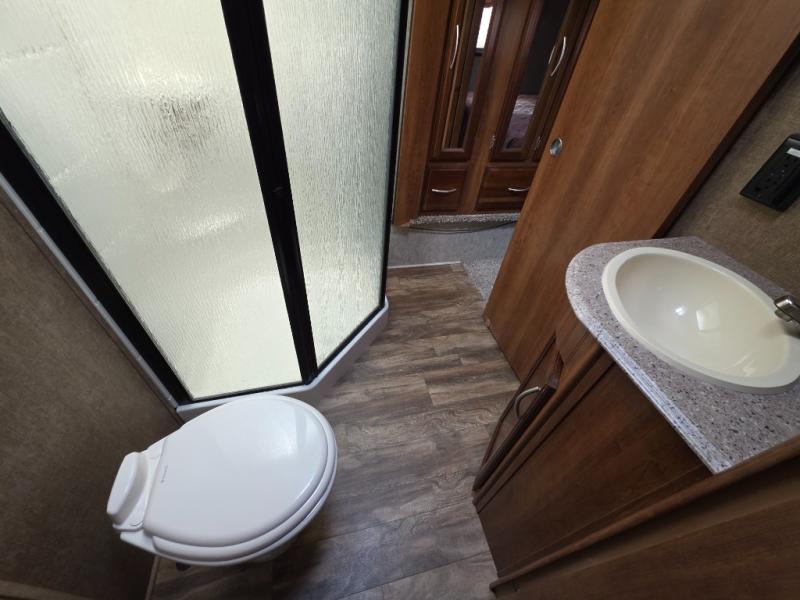 Back at the entry door head to the right up a step to the front master bedroom and complete bath. The bath is on your left at the top and offers a spacious place to freshen up. There is a corner shower, toilet, and vanity with sink. A second entry door in the bath leads into the front master where you have easy access to the linen and wardrobe storage slide out.
