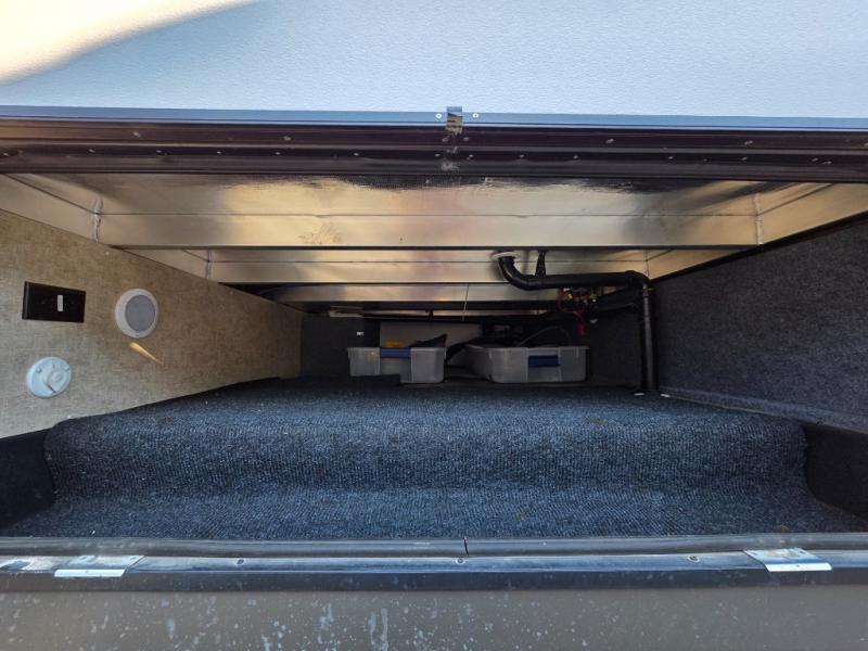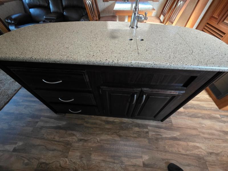 Check out the cooking area before heading inside. Along the curb side within the outer slide you will find a refrigerator, overhead storage, and a two burner cook-top. This will make cooking meals easy when you want to enjoy the great outdoors.