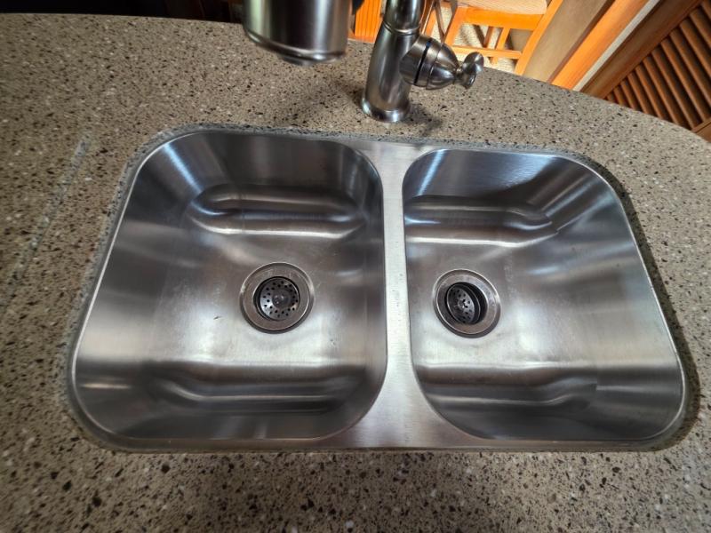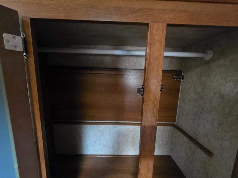 On the inside you will also find cooking your favorite meals easy with the amenities provided. There is a three burner range to the left as you enter, along with an 8 cu. ft. refrigerator, and counter space. You will find the center island handy for food prep and clean-up as it also features a double sink. There are plenty of storage cabinets above and below the counter top, and a nice storage pantry can be found along the interior living room wall straight inside the door. Next to it is a closet for additional storage.
